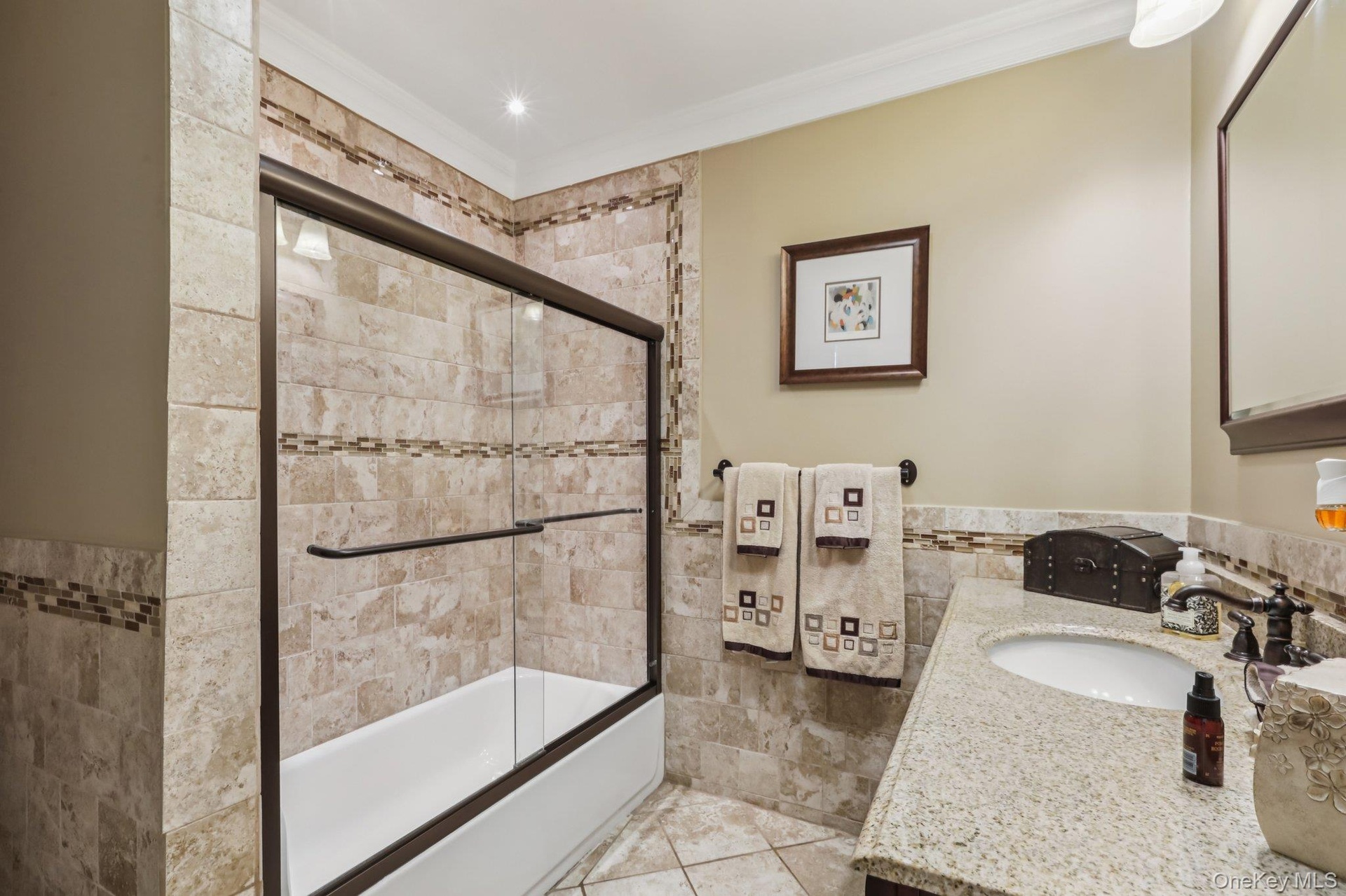 - Full bath featuring tile walls, shower / bath combination with glass door, wainscoting, vanity, and light tile patterned flooring