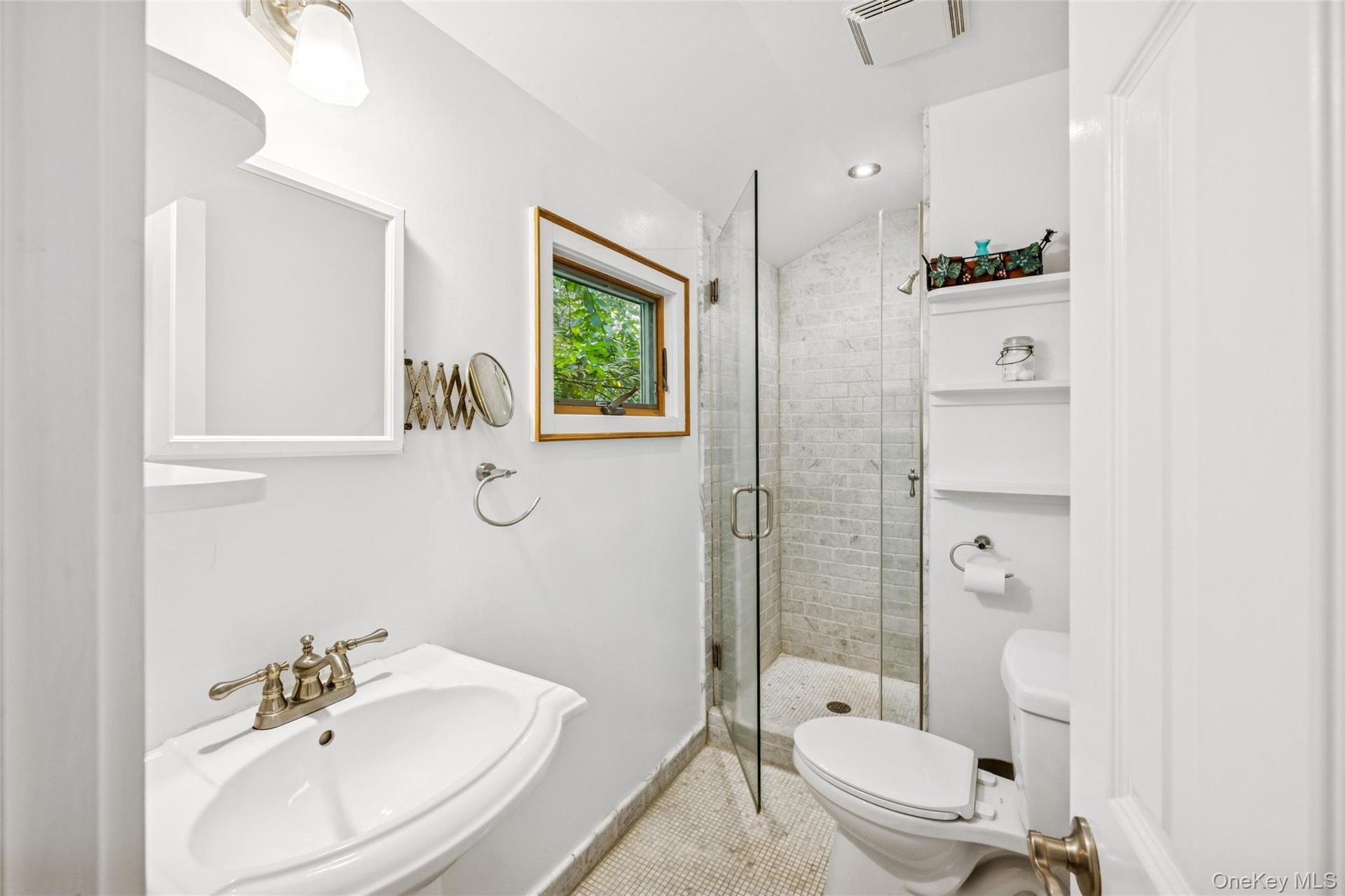 - Kitchen with white cabinets, appliances with stainless steel finishes, vaulted ceiling
