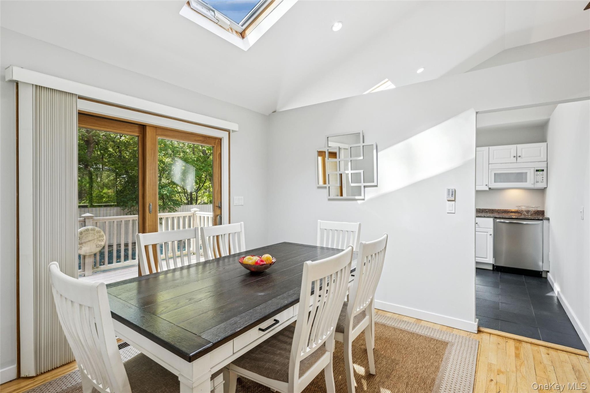 - Dining space featuring a skylight, hardwood floors, lofted ceiling