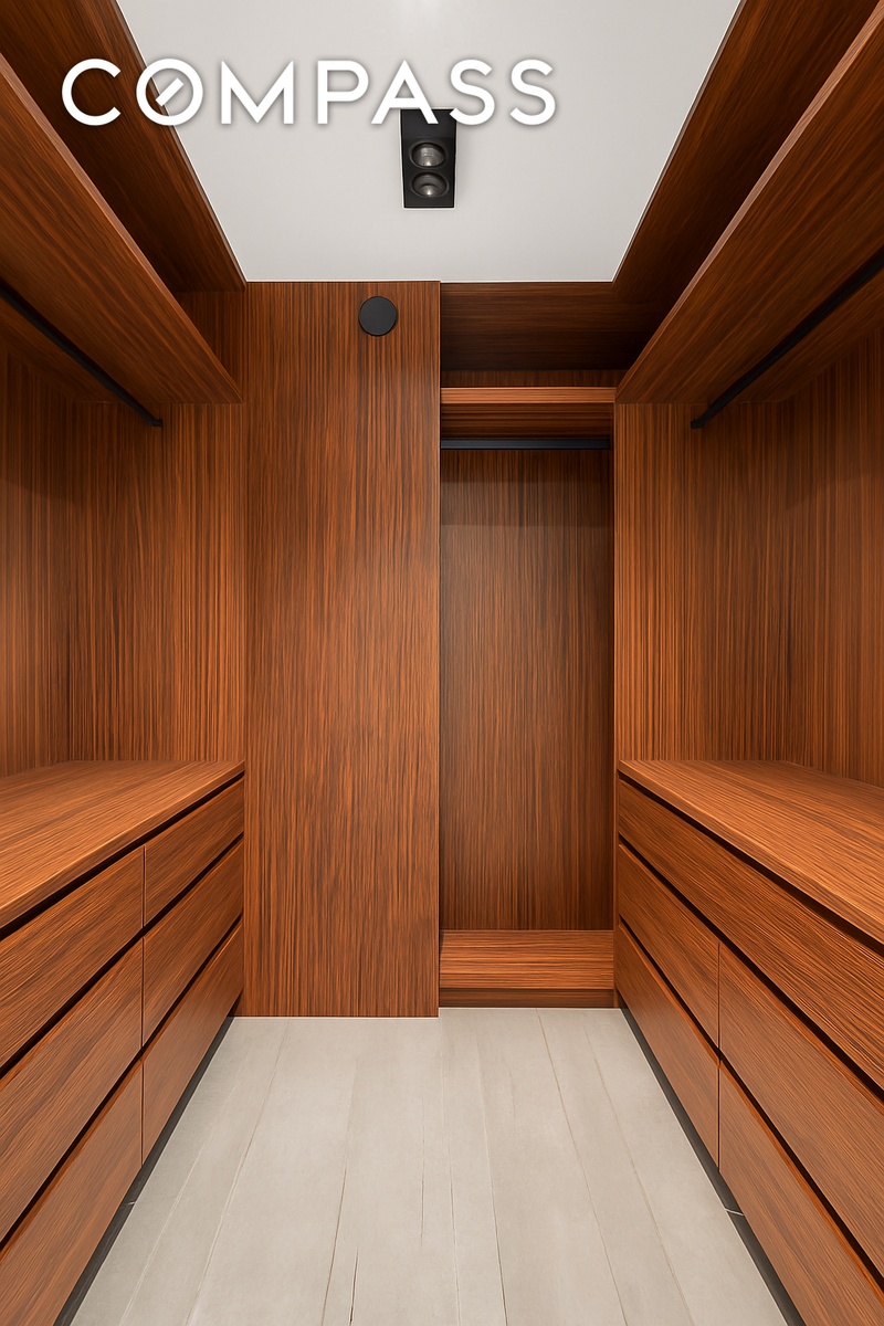 Step into a light-filled living space defined by a 23-foot-wide, steel-framed glass wall, two Juliet balconies, and northeastern and southwestern exposures that bathe the home in natural light throughout the day. The open-concept living, kitchen, and dining area is anchored by a sculptural rosewood island topped with minimalist Italian black ceramic and a suspended black table—equal parts art and utility. Sleek black Miele appliances, floor-to-ceiling rosewood cabinetry, and refined lighting elements complete this chef's dream kitchen.