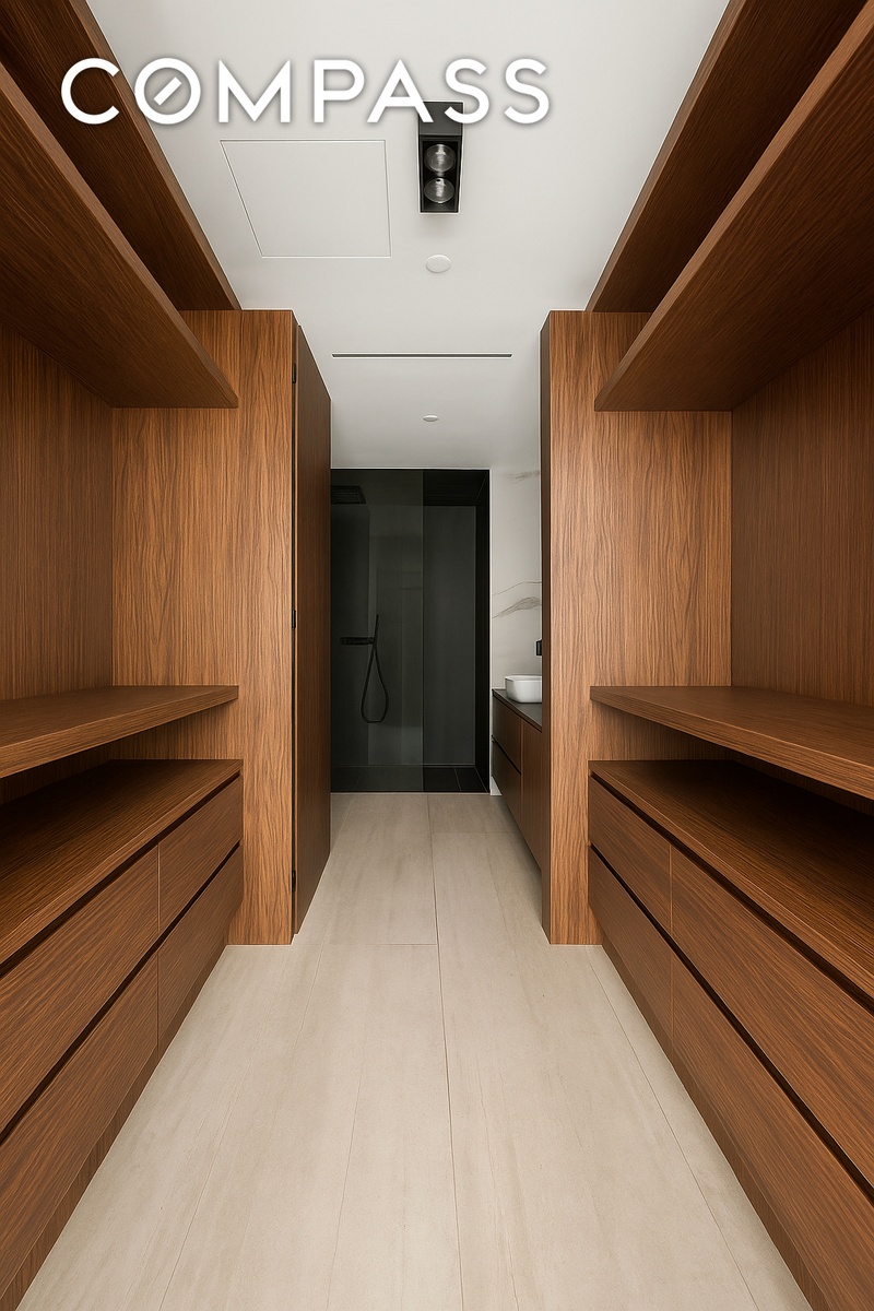 The primary suite is a serene retreat, featuring a wall of north-facing windows, private balcony, and a custom walk-in closet with built-in rosewood storage. The ensuite bathroom exudes luxury with marbled ceramic walls, a dual-sink rosewood vanity, Duravit bidet, and a dramatic lava-black walk-in shower.
