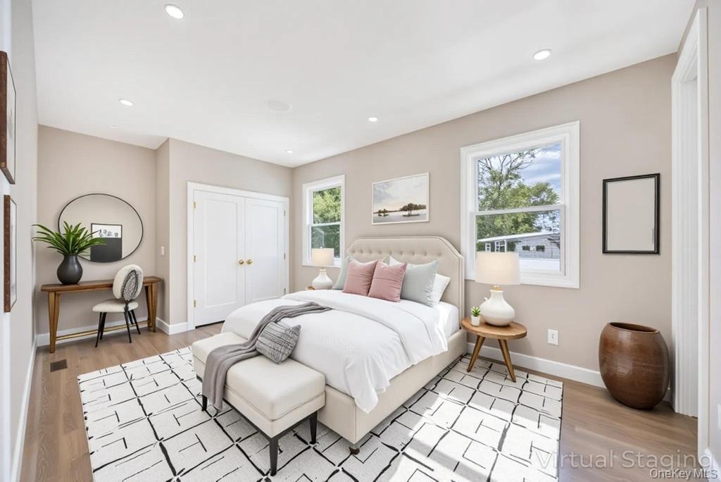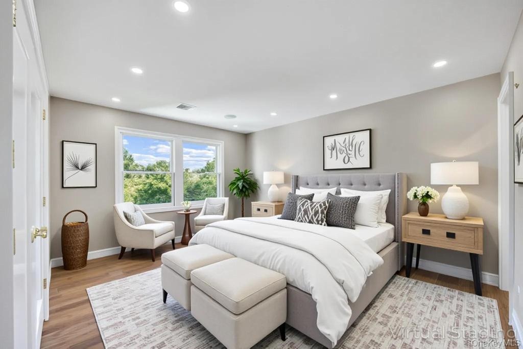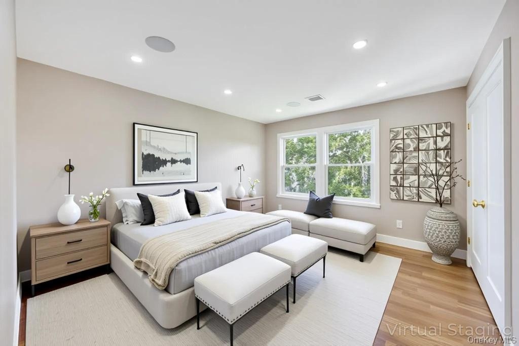 - Bedroom with light wood finished floors and recessed lighting