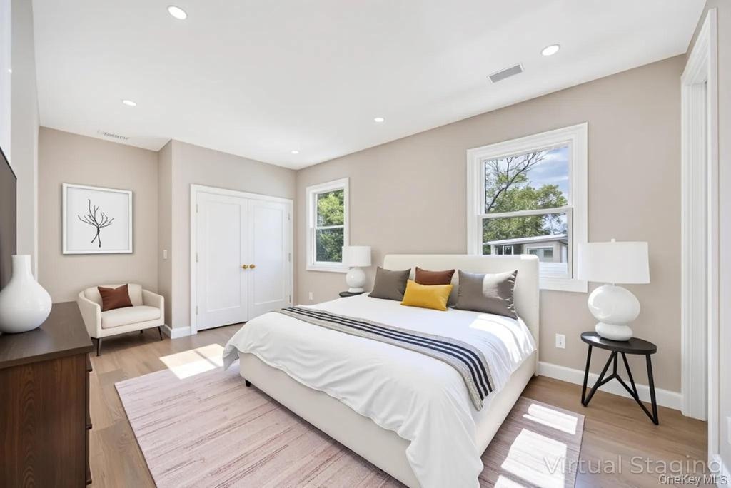 - Bedroom with light wood-style flooring, recessed lighting, and a closet