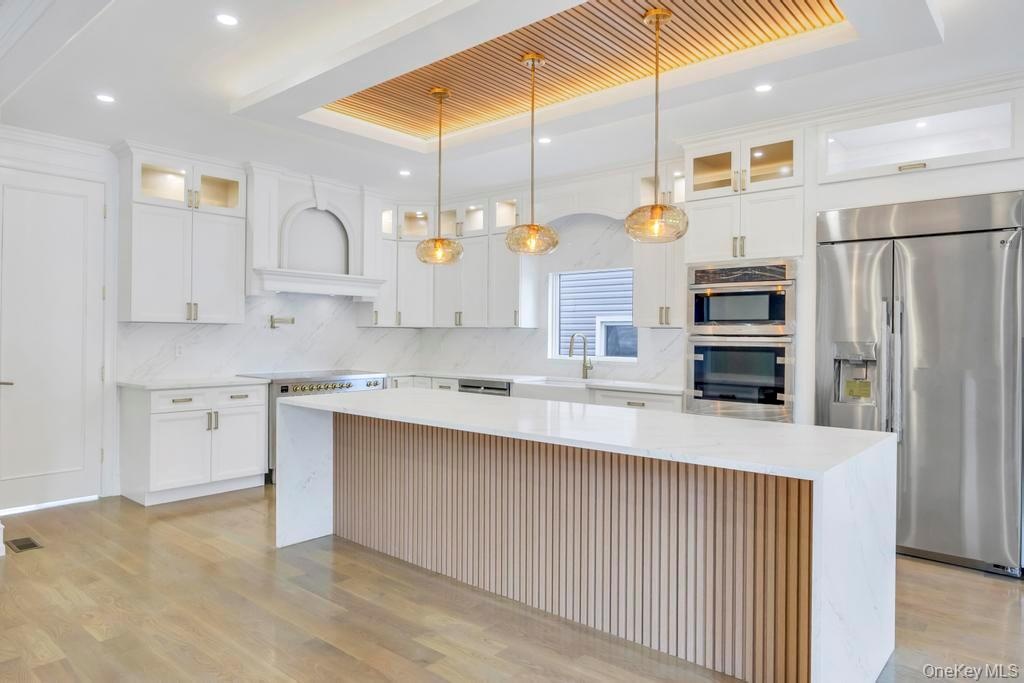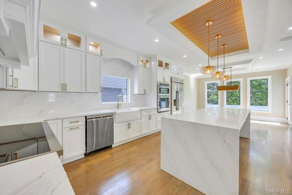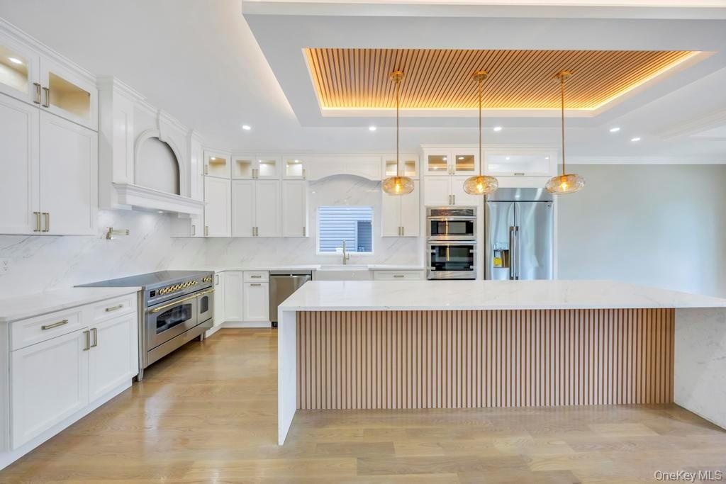 - Kitchen with glass insert cabinets, a raised ceiling, appliances with stainless steel finishes, light stone countertops, and a spacious island