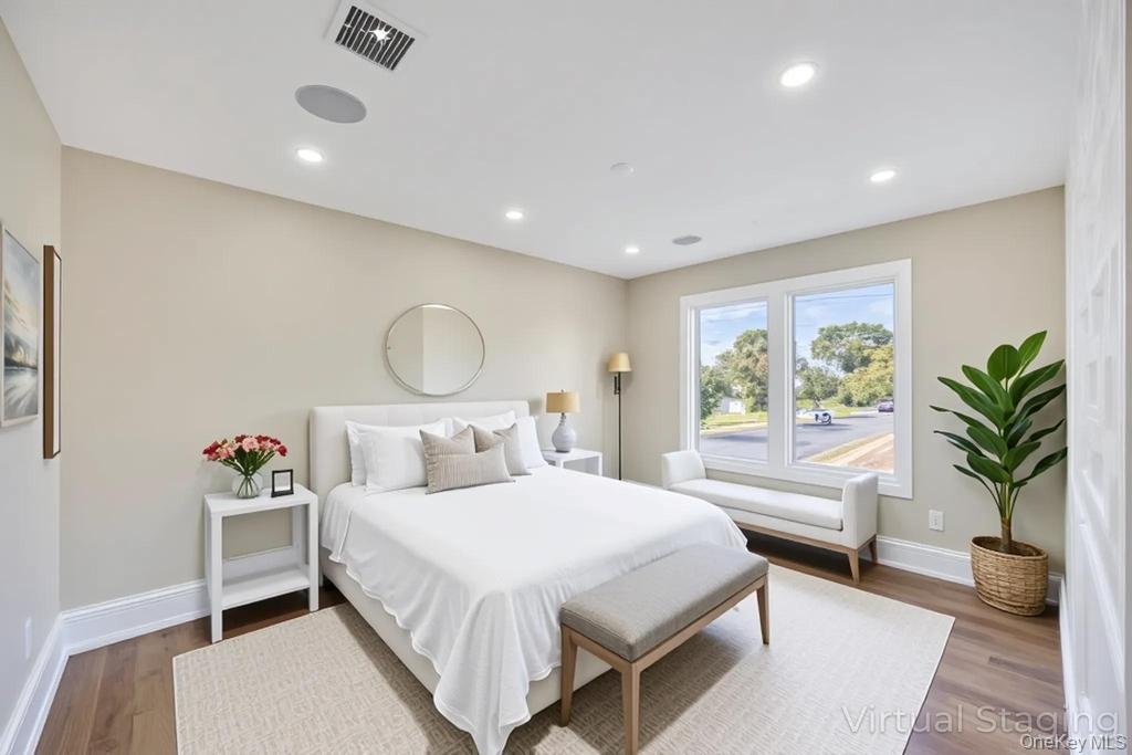 - Bedroom with dark wood-style floors and recessed lighting