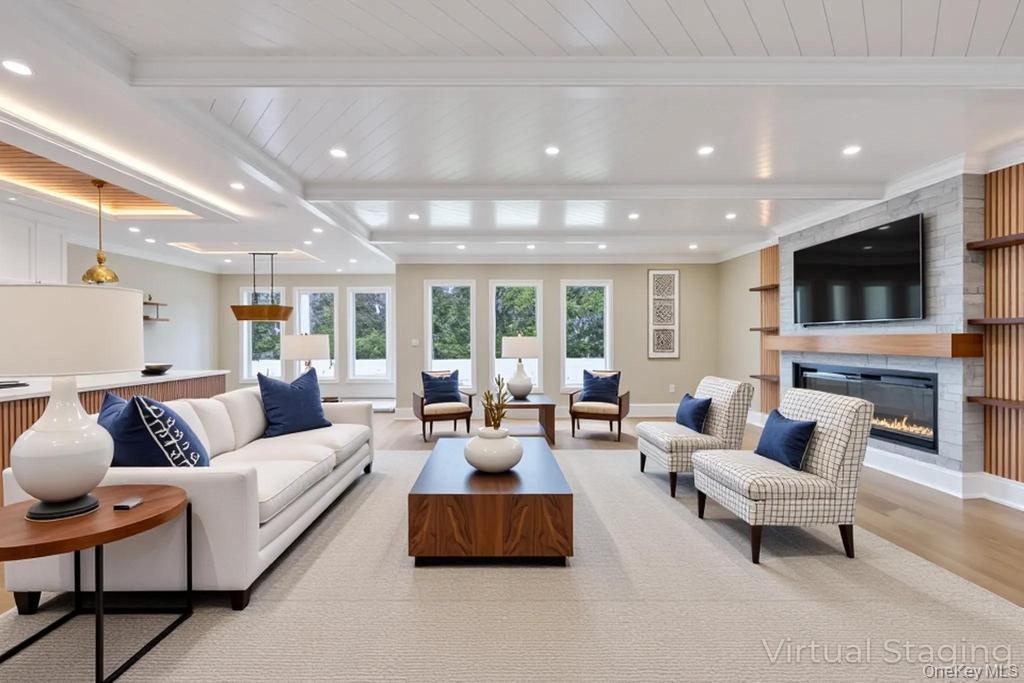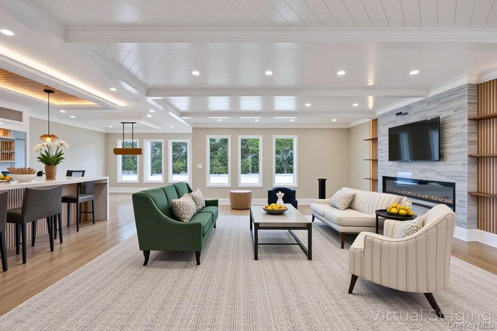 - Living room with beamed ceiling, light wood-style flooring, recessed lighting, crown molding, and a fireplace