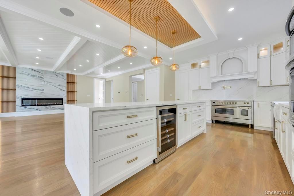 - Kitchen featuring white cabinets, a raised ceiling, open floor plan, a premium fireplace, and light stone countertops