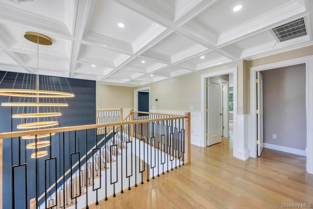 - Hall with an upstairs landing, light wood finished floors, beamed ceiling, coffered ceiling, and recessed lighting