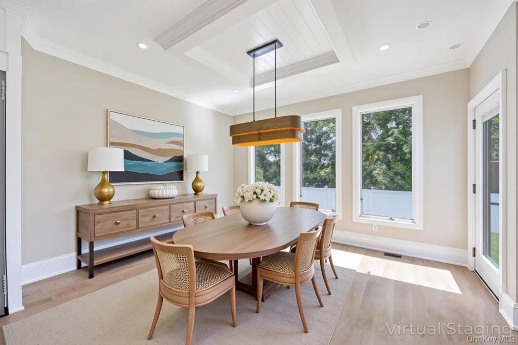 - Dining area with light wood-type flooring, crown molding, and recessed lighting