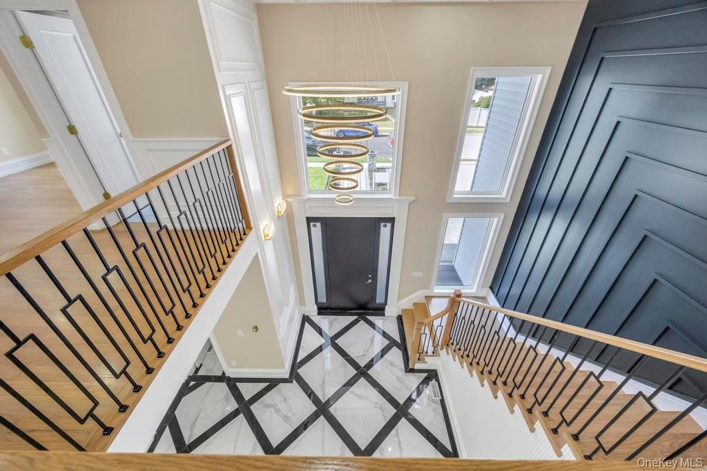 - Foyer entrance featuring inlaid floor details, marble tiled flooring, stairs, recessed lighting, and a high ceiling