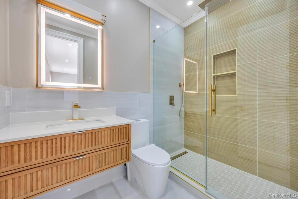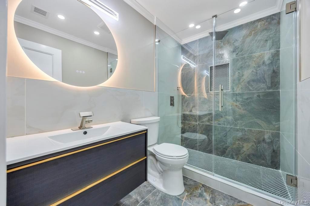 - Full bath with a shower stall, vanity, tile walls, recessed lighting, and ornamental molding