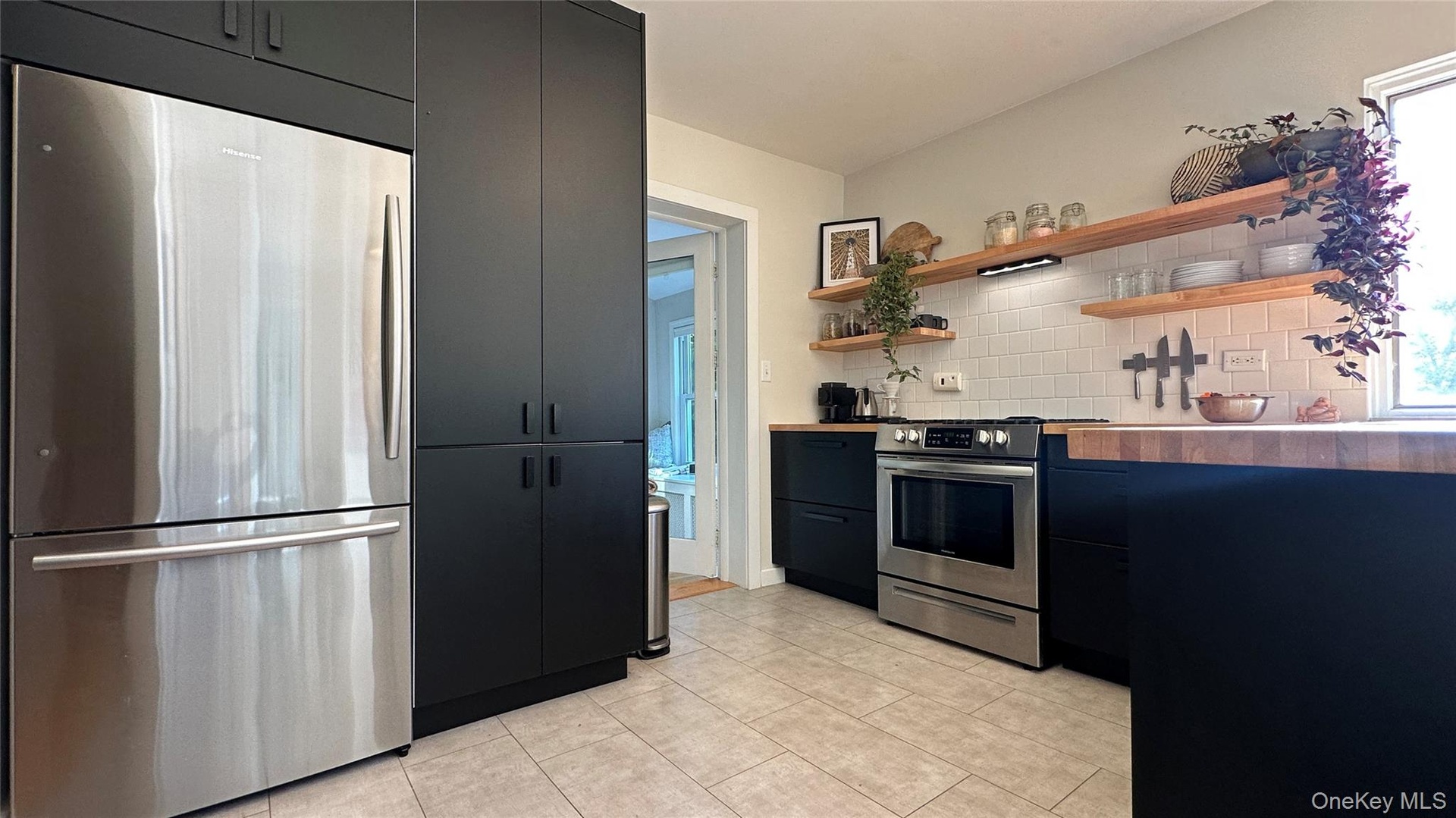 - Kitchen featuring stainless steel appliances, open shelves, decorative backsplash, and light tile patterned floors