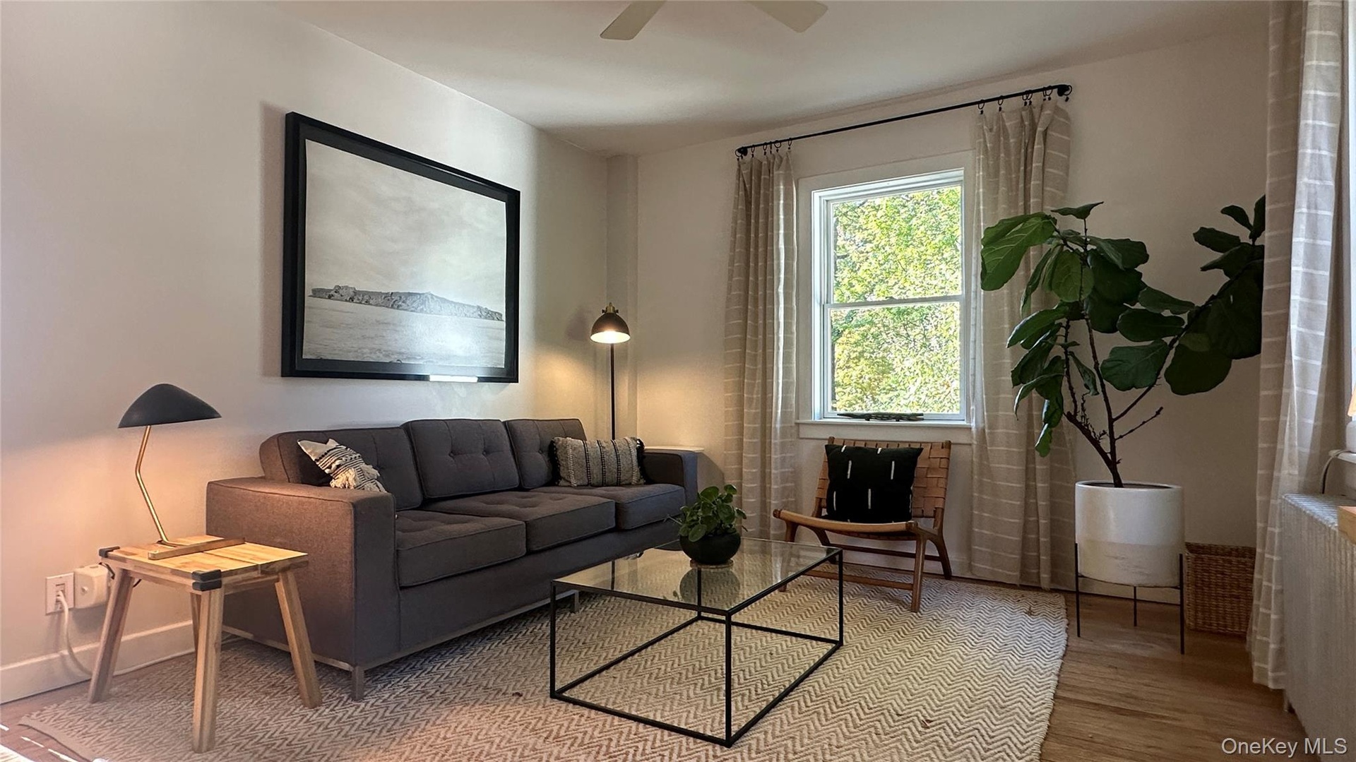 - Living area with a ceiling fan and wood finished floors