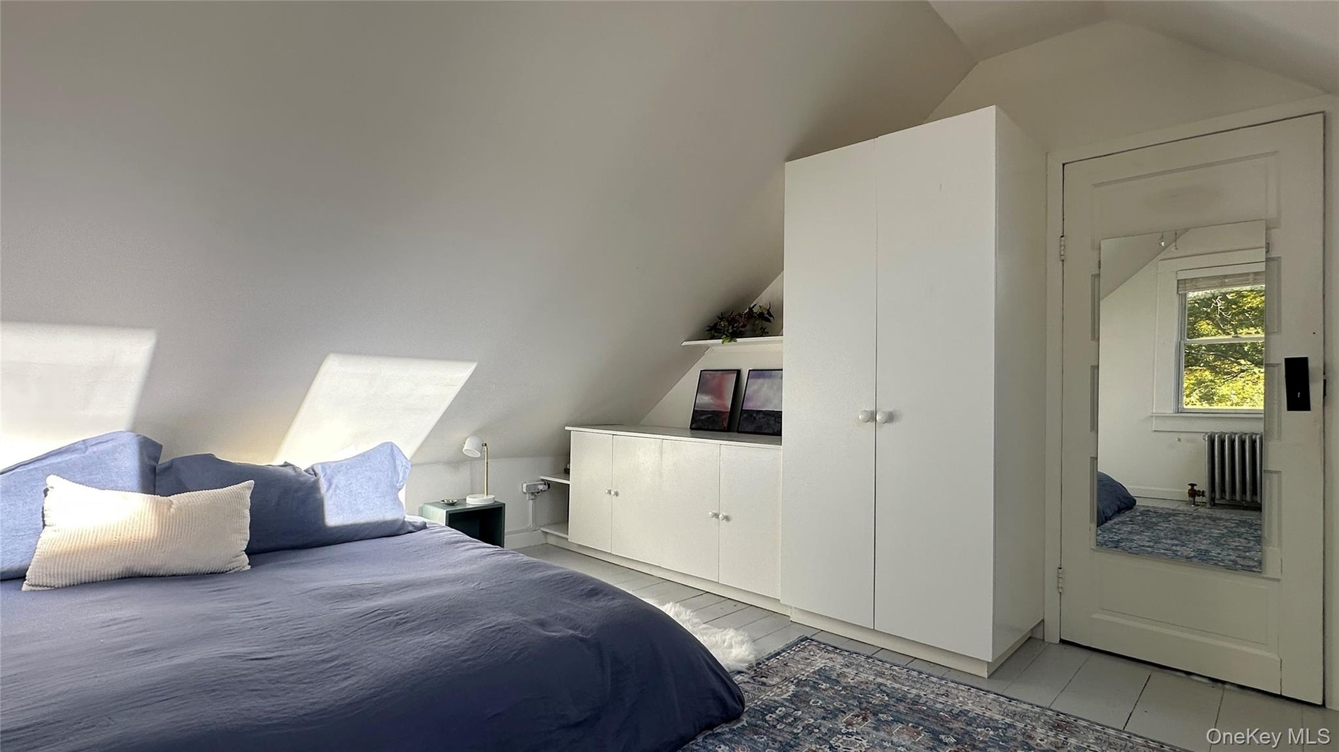 - Bedroom featuring lofted ceiling, radiator, and light tile patterned floors