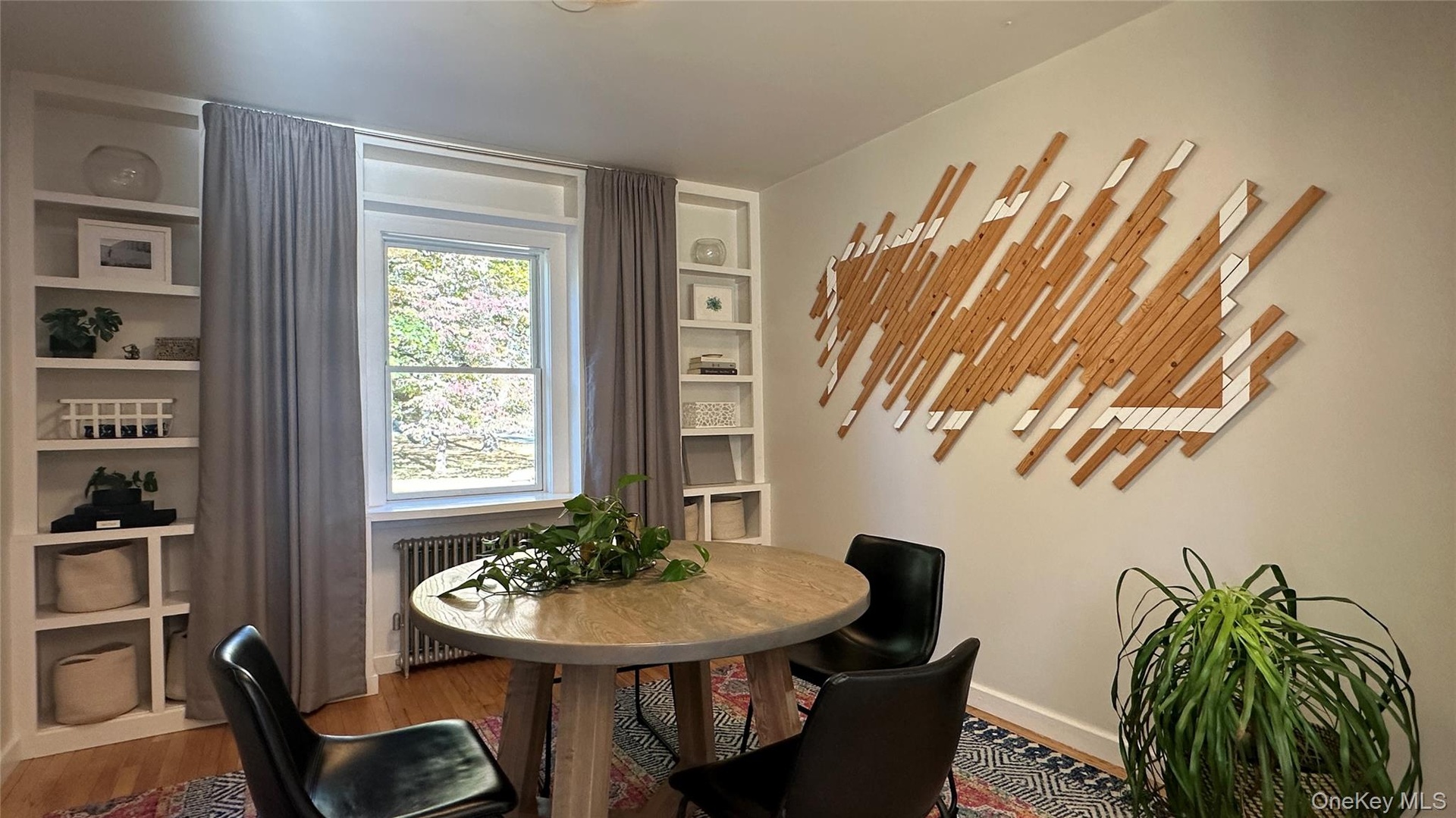 - Living area with wood finished floors and radiator heating unit