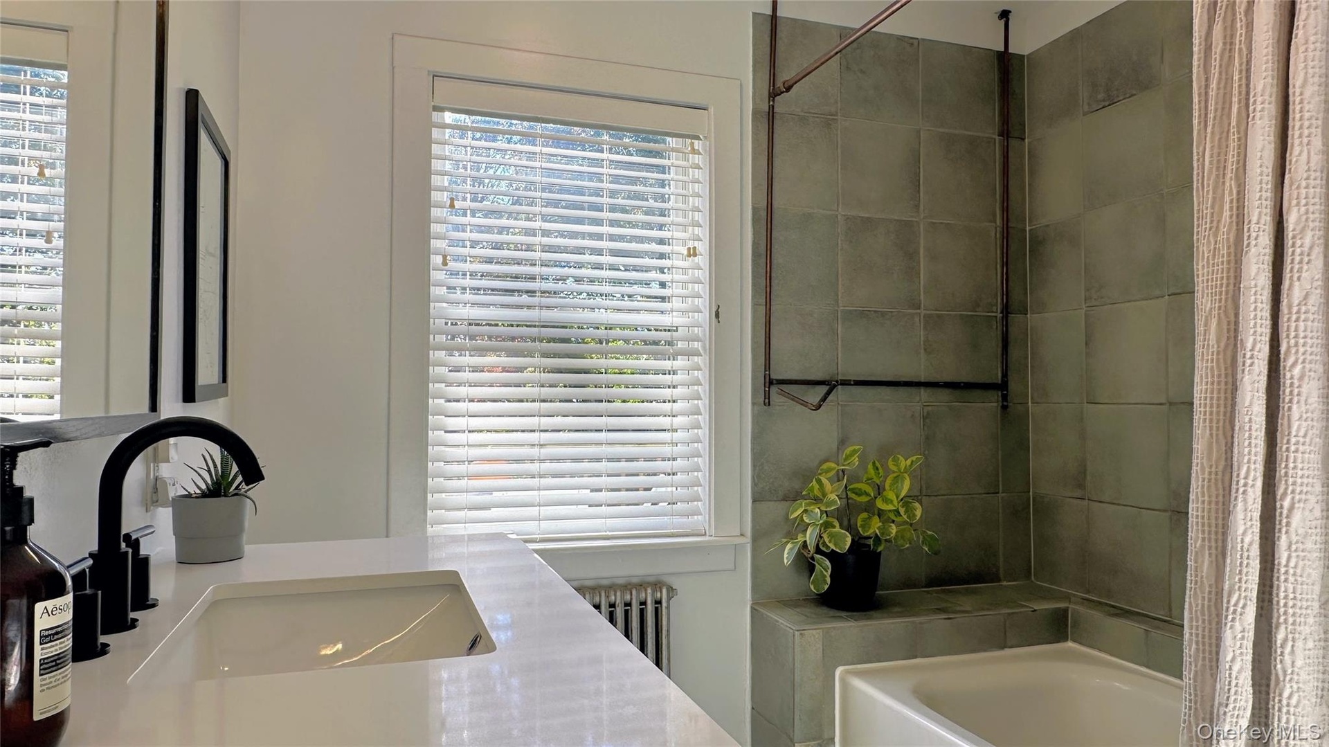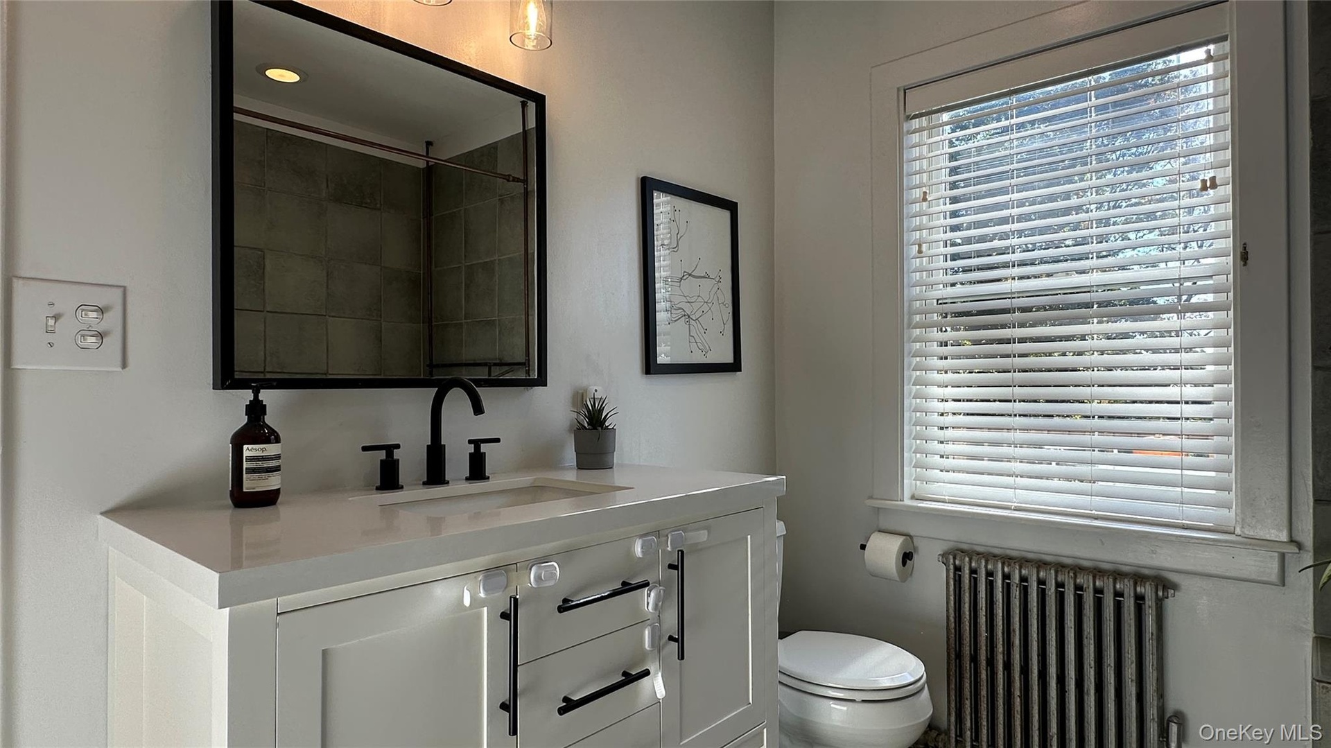 - Full bathroom with radiator, vanity, and plenty of natural light