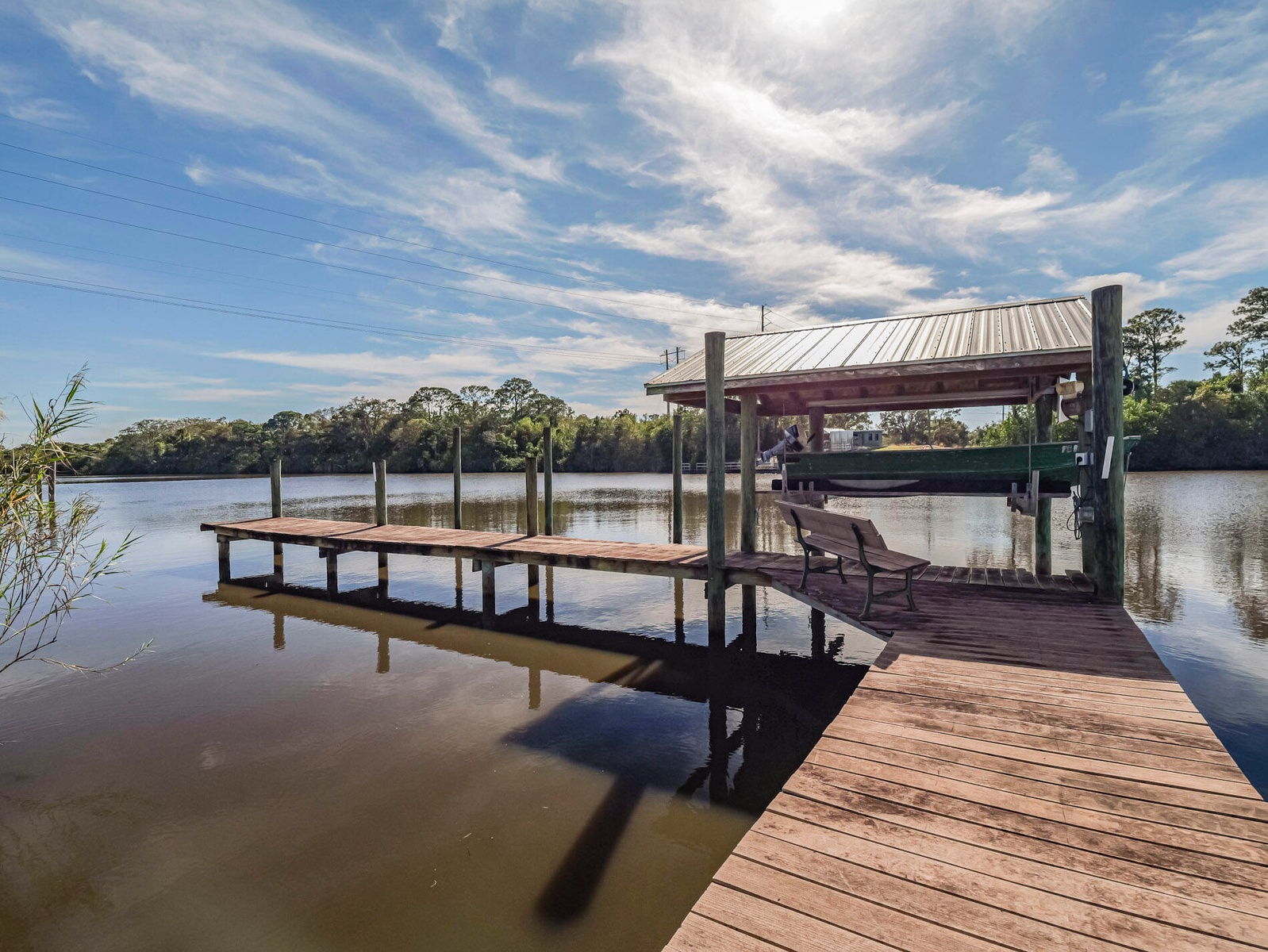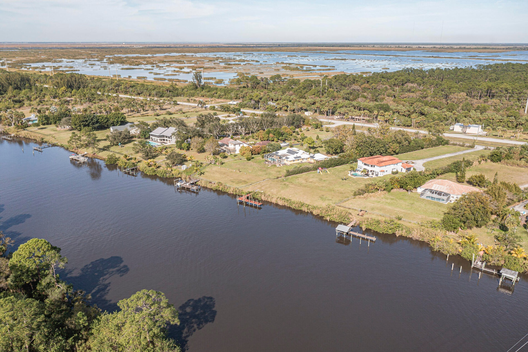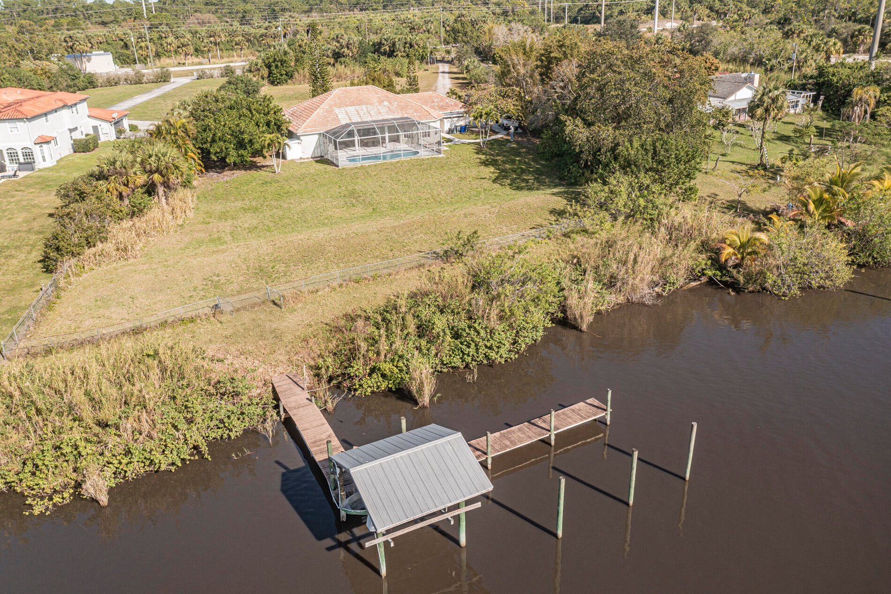 :BACK ON MARKET WITH BRAND NEW ROOF!! What a fantastic opportunity to own almost 2.5 acres of WATERFRONT property! This 3BR/2BA CBS home sits right on the deep waters with access to the Atlantic, Gulf and Okeechobee waterways! Features a private dock with a lift and a view that goes on forever!! Watch the boats go by from your screened lanai (new screens just installed) and recently updated pool. The home features tastefully updated bathrooms, a split bedroom plan, tile floors throughout and new water filtration system. The light and bright white kitchen boasts granite countertops, stainless appliances, gas range, wine fridge & a view of the river from your kitchen island! 1/2 acre of property across the road is perfect for a car enthusiast or to house your toys/RV etc. NO HOA