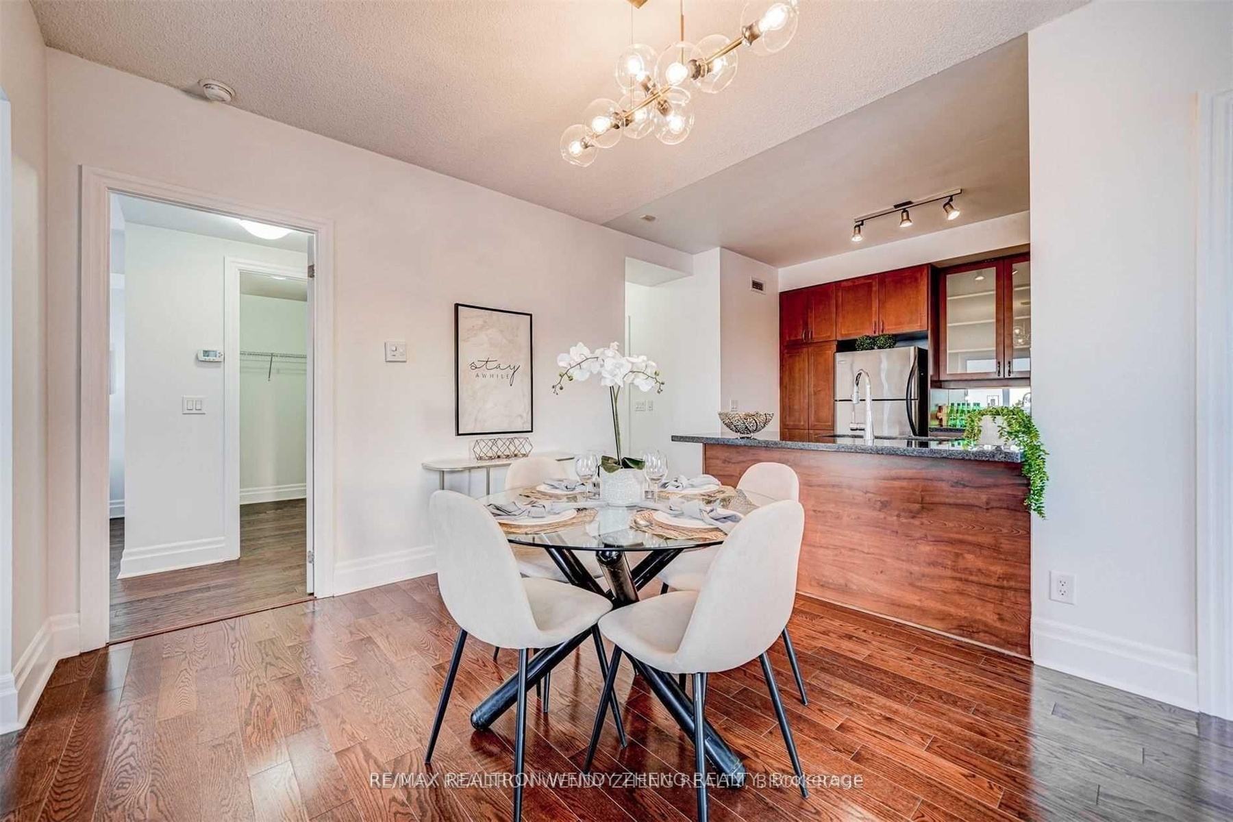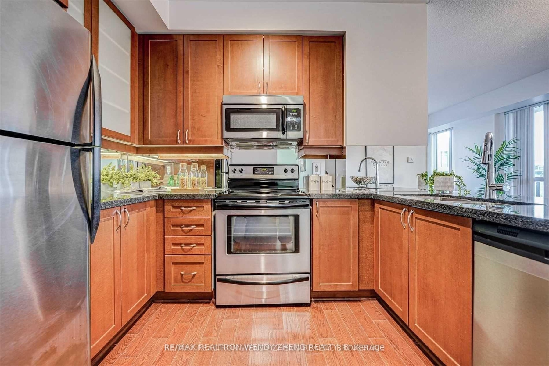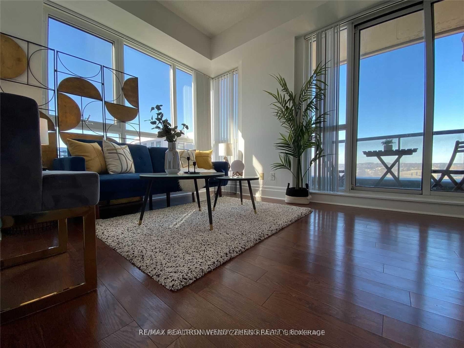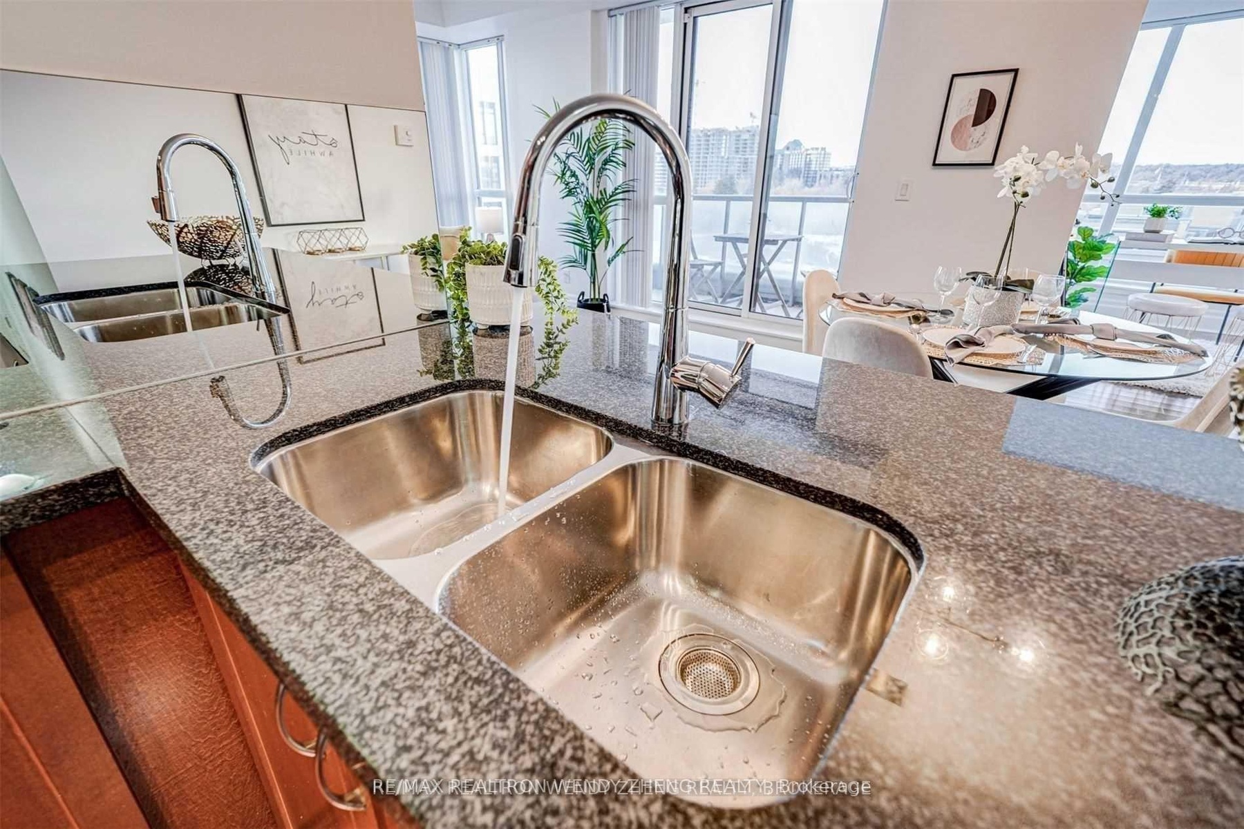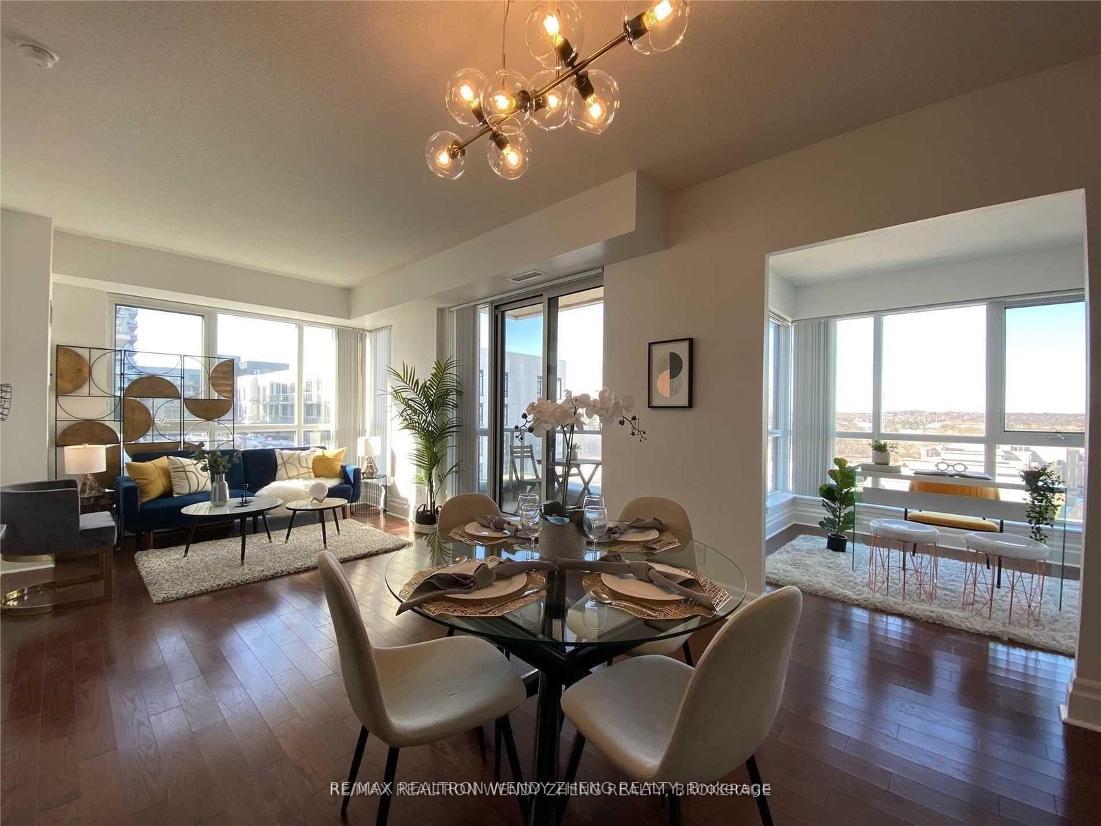 Remington's Iconic Rouge Bijou Condos in Downtown Markham! This oversized 2+1 bedroom, 2 full bath corner suite is filled with natural light and offers a unique northwest-facing view of the pond and greenbelt. Featuring 9-ft ceilings, upgraded hardwood flooring throughout, a tall solid wood kitchen cabinet with mirrored backsplash and stone countertop in the eat-in kitchen. The primary bedroom boasts a 4-piece ensuite and walk-in closet, while the spacious den with two-way exposure can easily serve as a third bedroom. Steps to YRT, GO Station, Hwy 407, Cineplex, shops, and restaurants. One parking and one locker included.