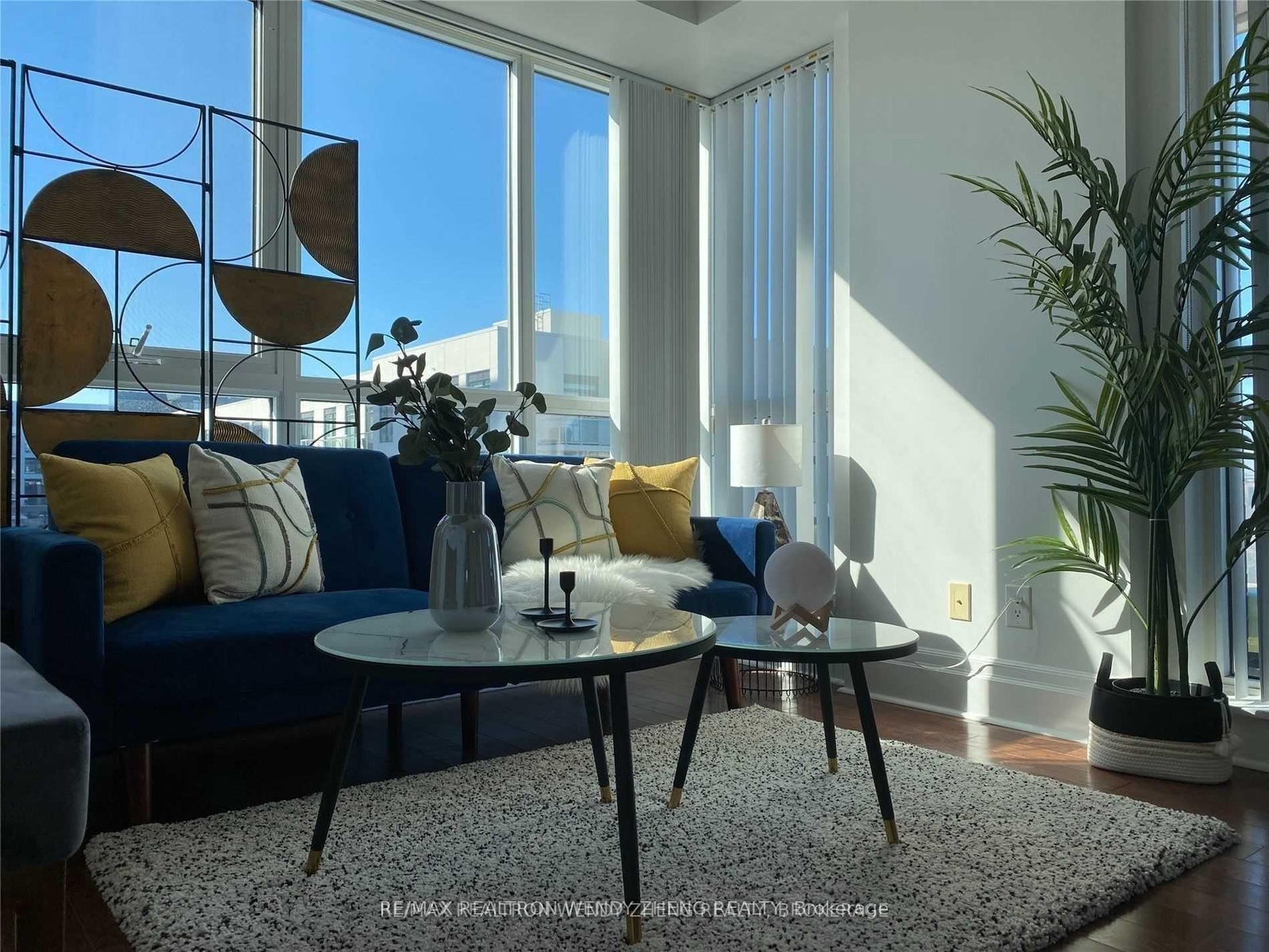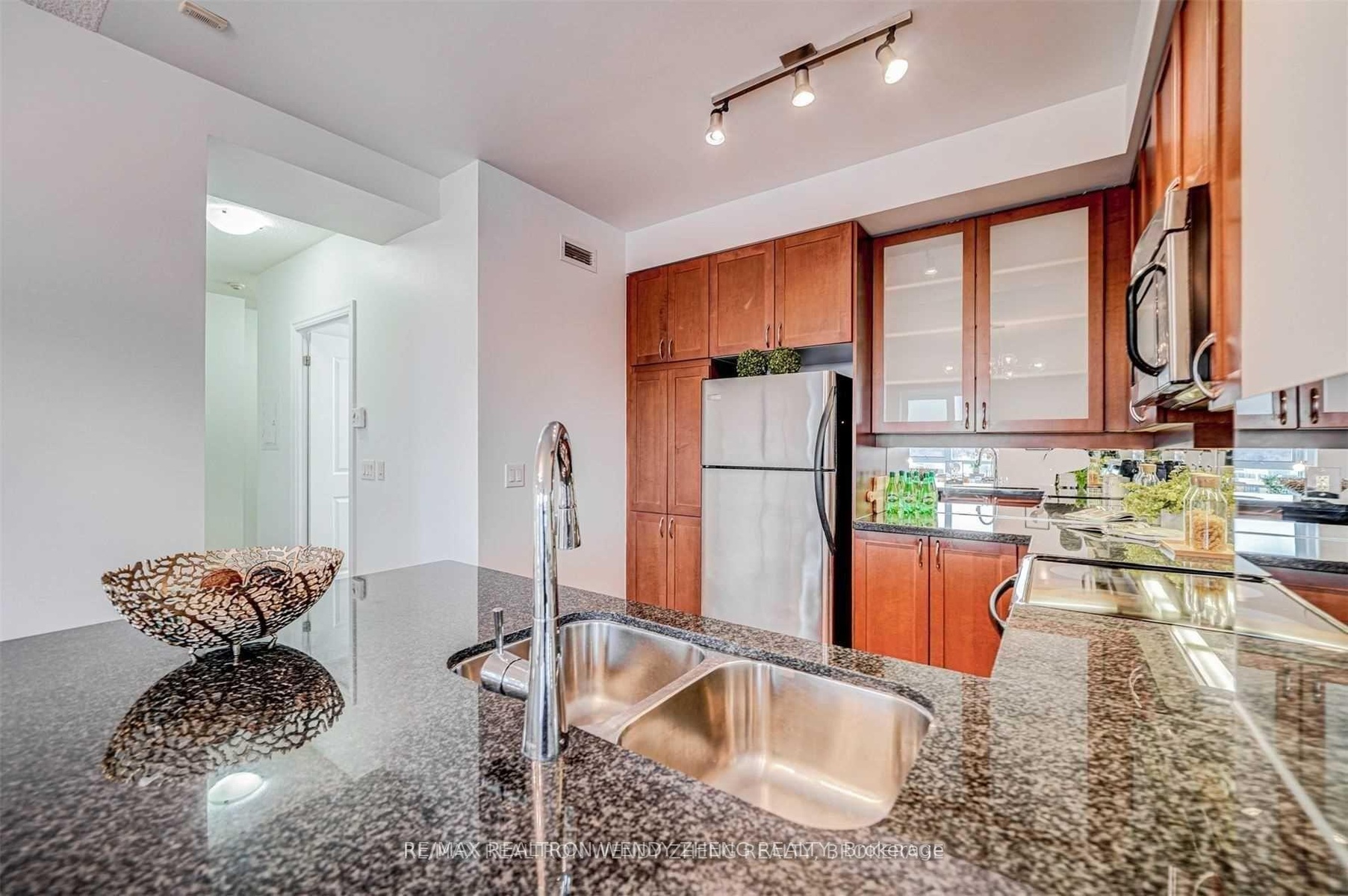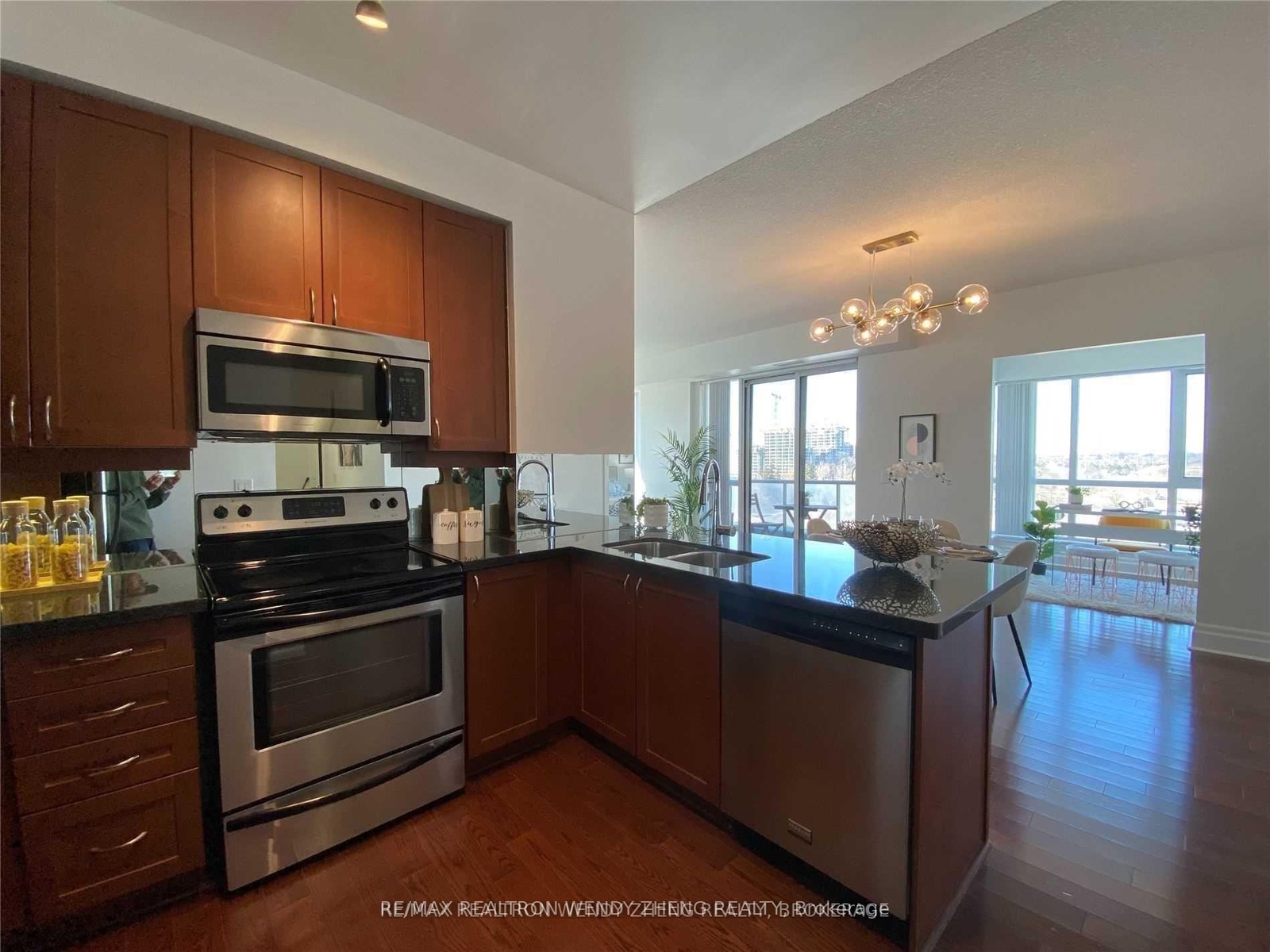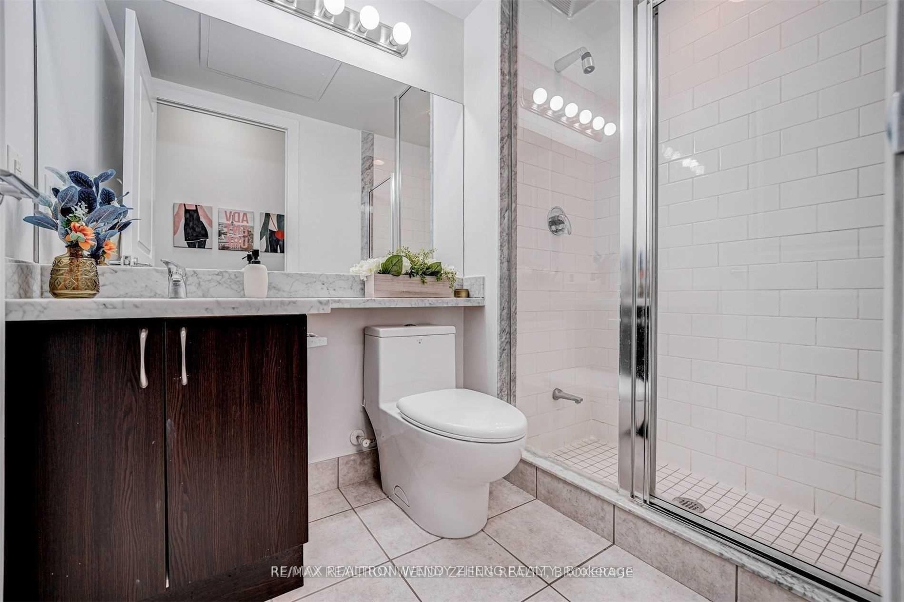 Remington's Iconic Rouge Bijou Condos in Downtown Markham! This oversized 2+1 bedroom, 2 full bath corner suite is filled with natural light and offers a unique northwest-facing view of the pond and greenbelt. Featuring 9-ft ceilings, upgraded hardwood flooring throughout, a tall solid wood kitchen cabinet with mirrored backsplash and stone countertop in the eat-in kitchen. The primary bedroom boasts a 4-piece ensuite and walk-in closet, while the spacious den with two-way exposure can easily serve as a third bedroom. Steps to YRT, GO Station, Hwy 407, Cineplex, shops, and restaurants. One parking and one locker included.
