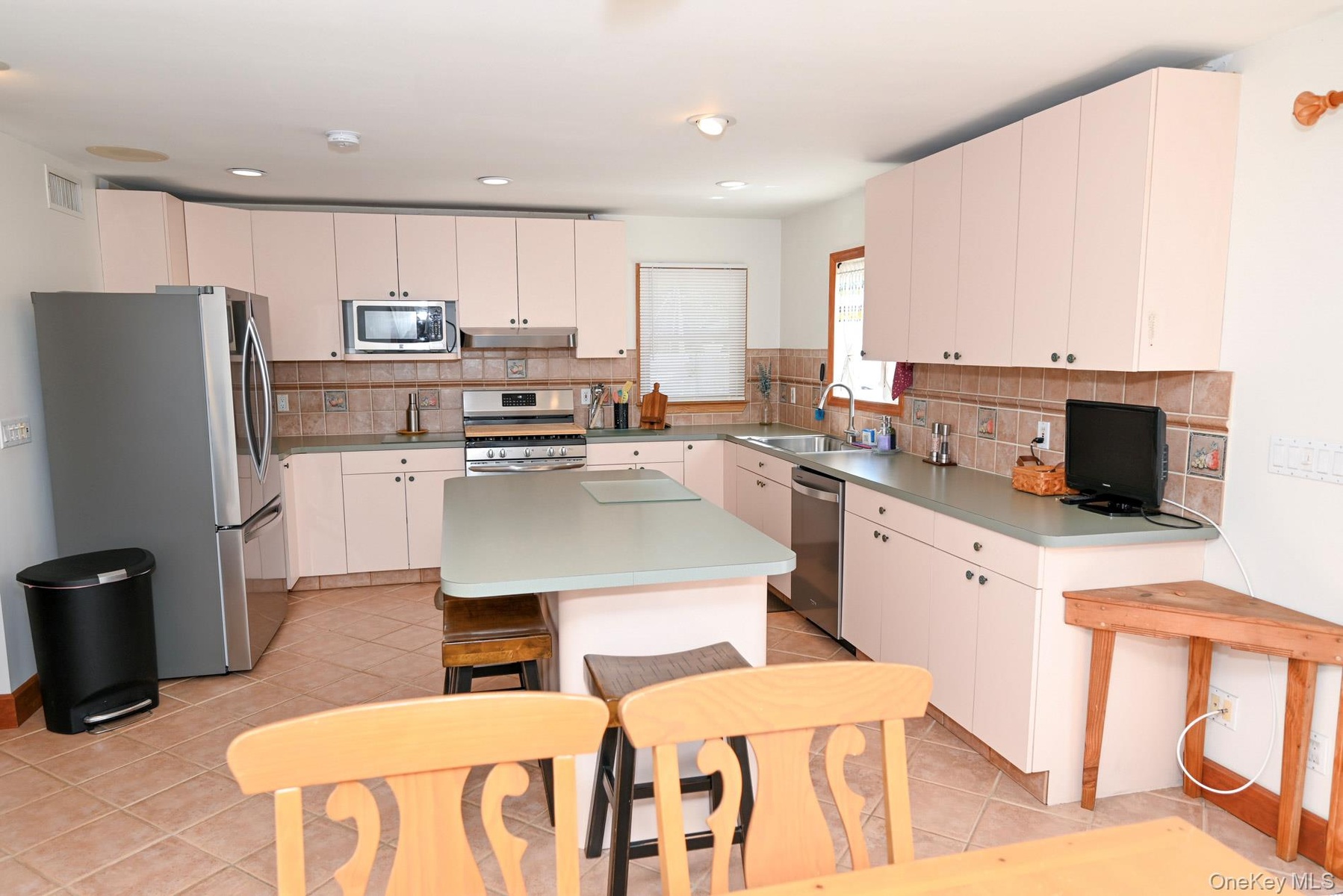 - Kitchen with appliances with stainless steel finishes, light tile patterned floors, white cabinetry, backsplash, and a center island