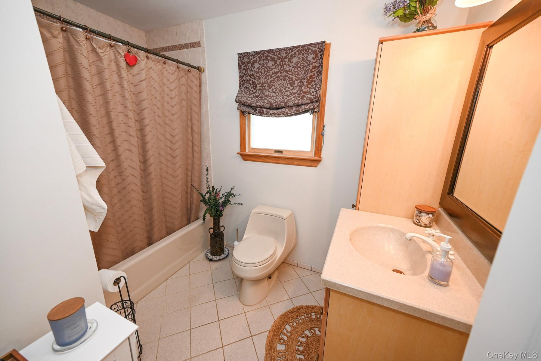 - Bathroom featuring vanity, shower / bath combination with curtain, and light tile patterned floors