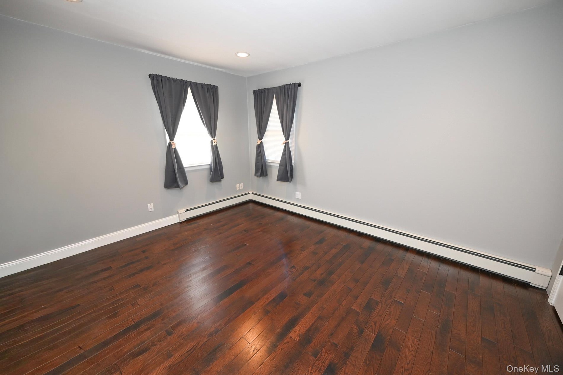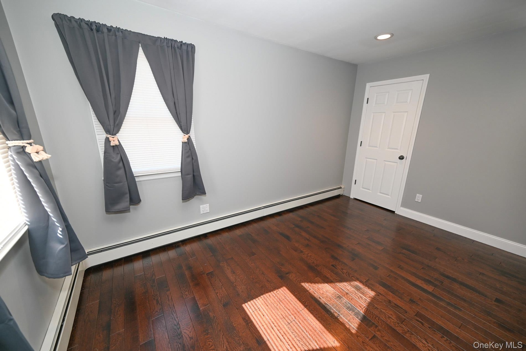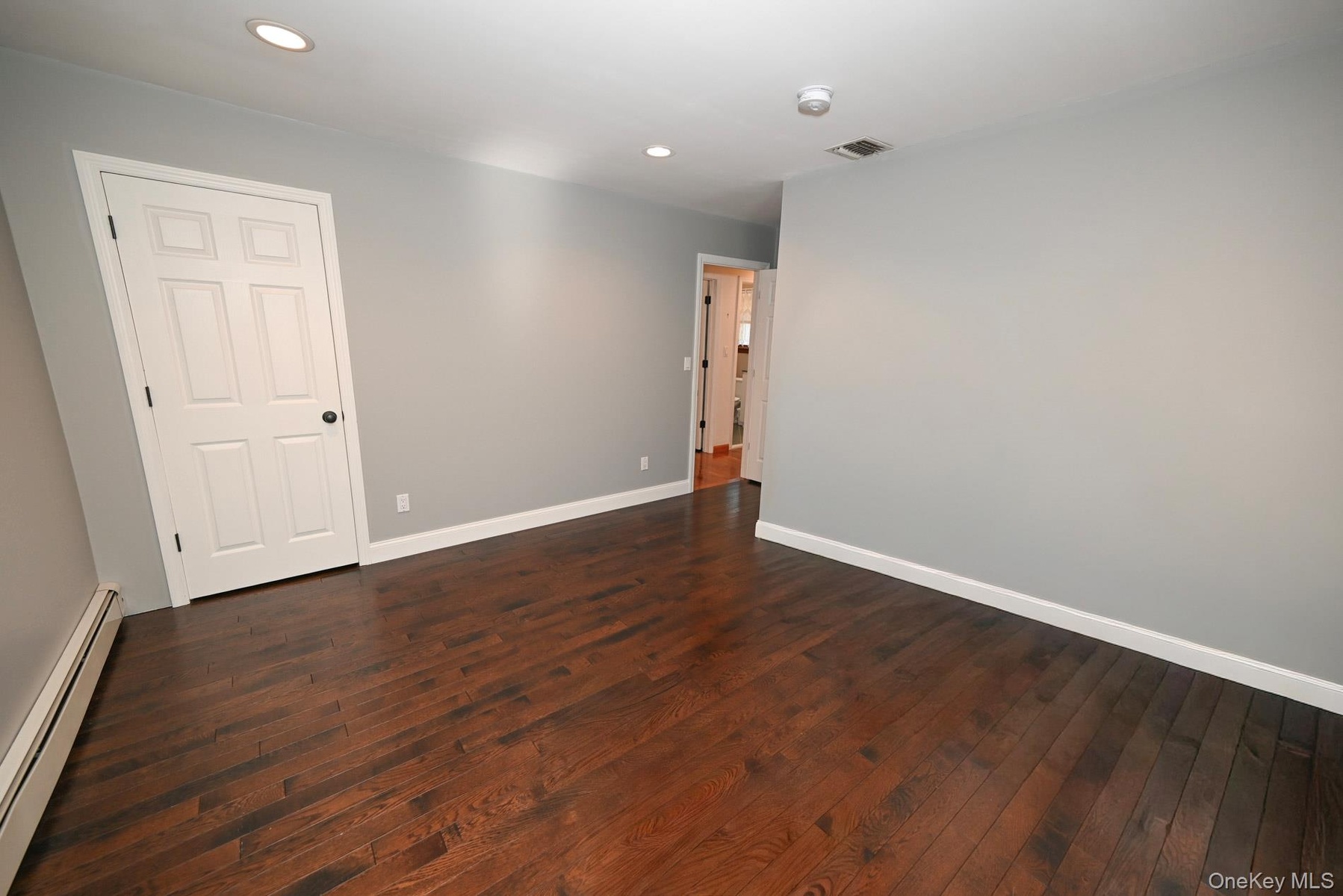 - Unfurnished room with dark wood-style floors, a baseboard radiator, and recessed lighting