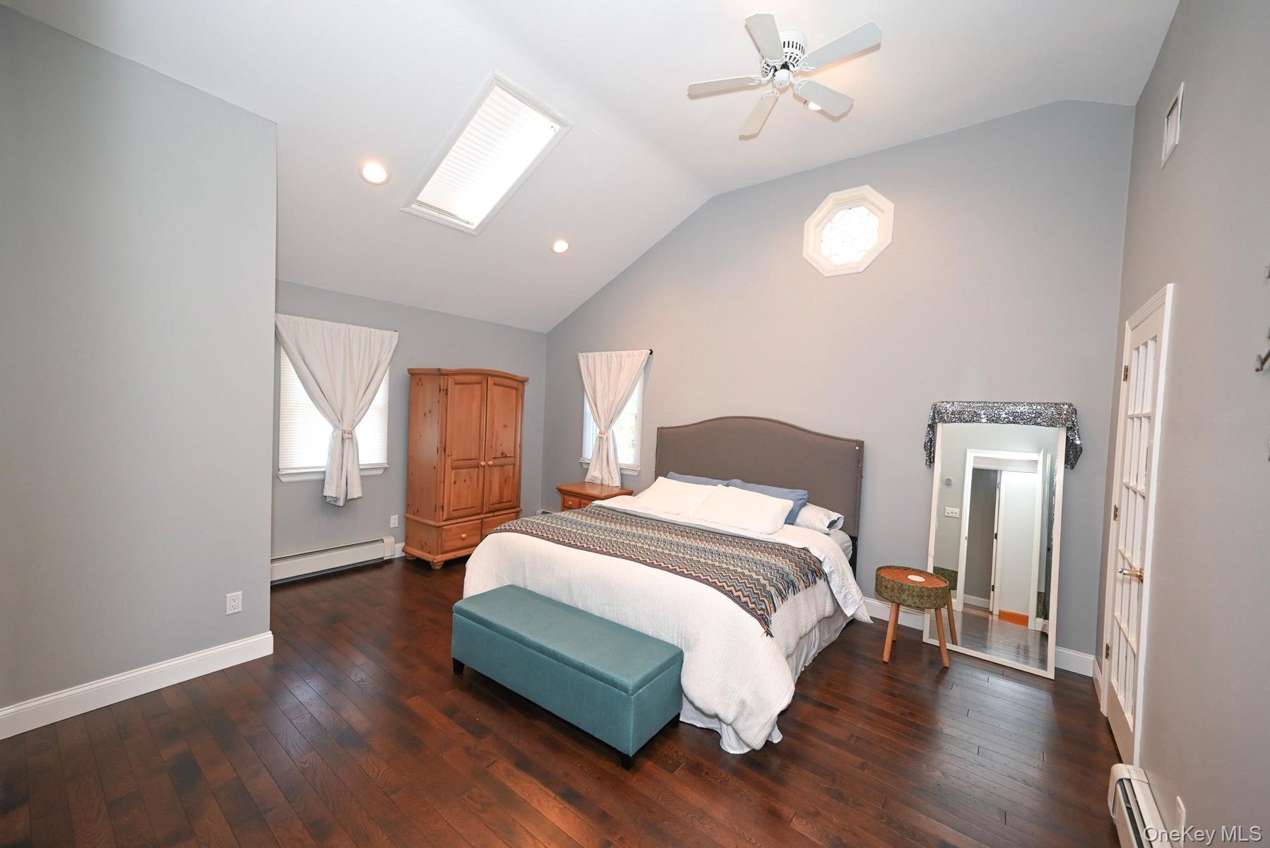 - Bedroom featuring dark wood-style floors, high vaulted ceiling, a baseboard radiator, ceiling fan, and a skylight