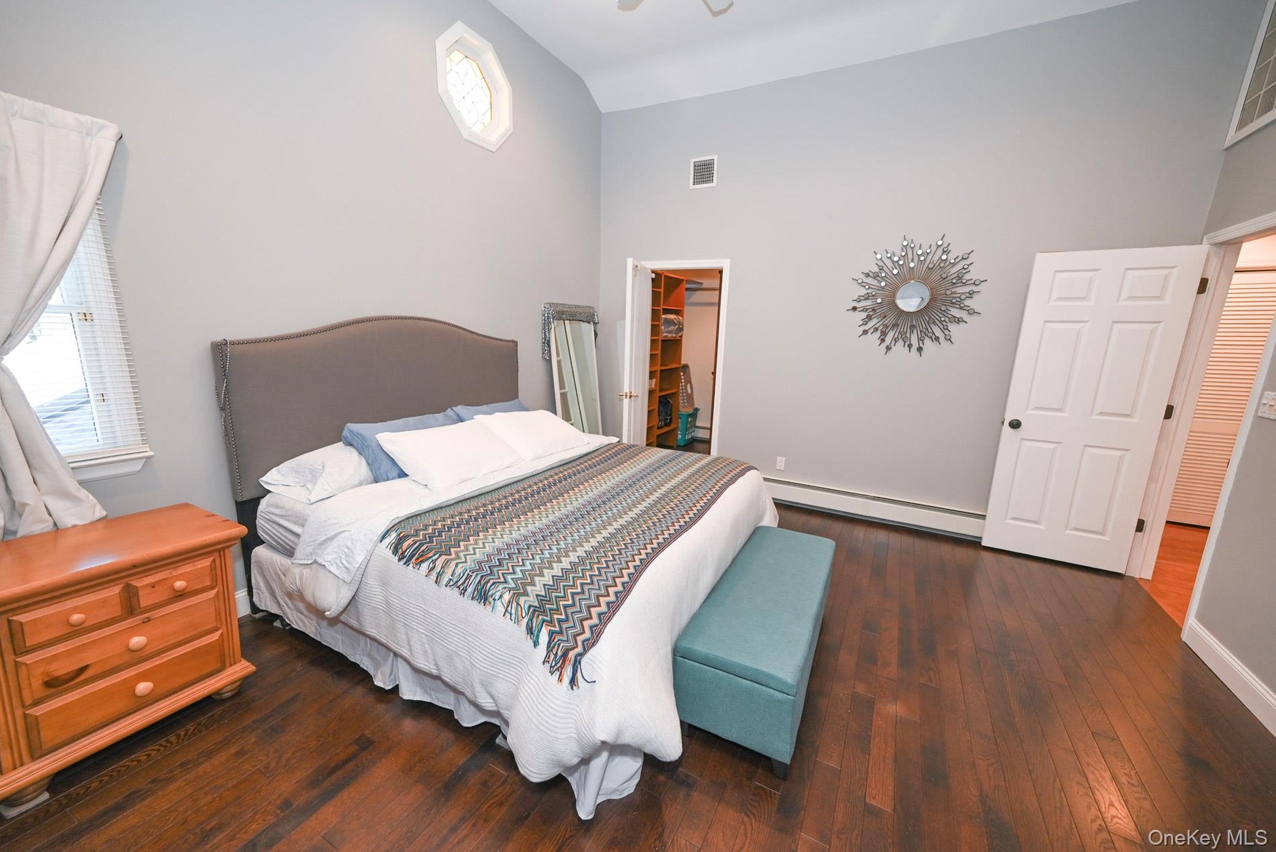- Bedroom with high vaulted ceiling, a baseboard heating unit, dark wood finished floors, and a walk in closet