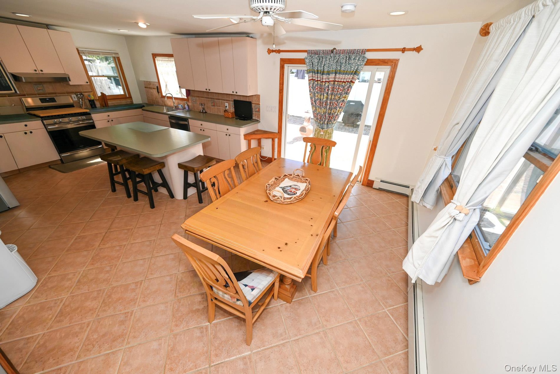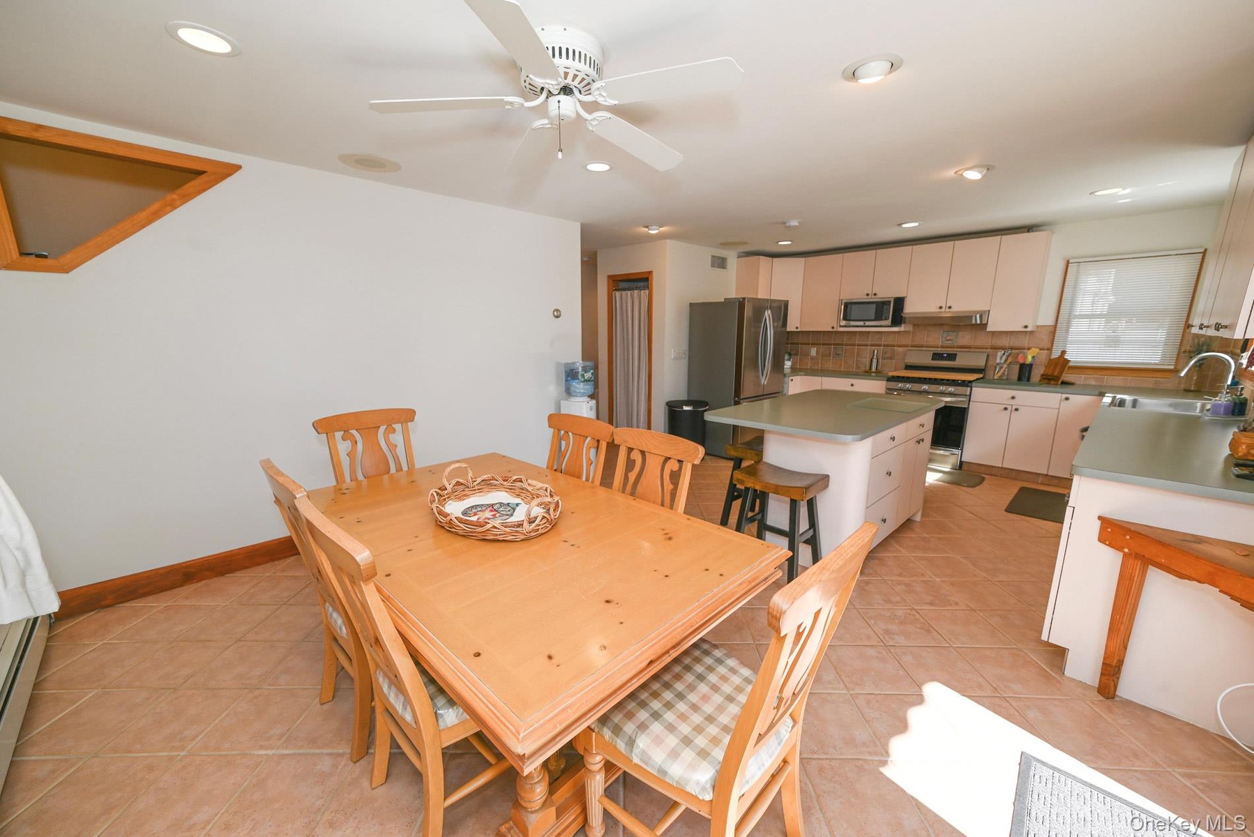 - Dining room with light tile patterned floors, a ceiling fan, recessed lighting, and a baseboard heating unit