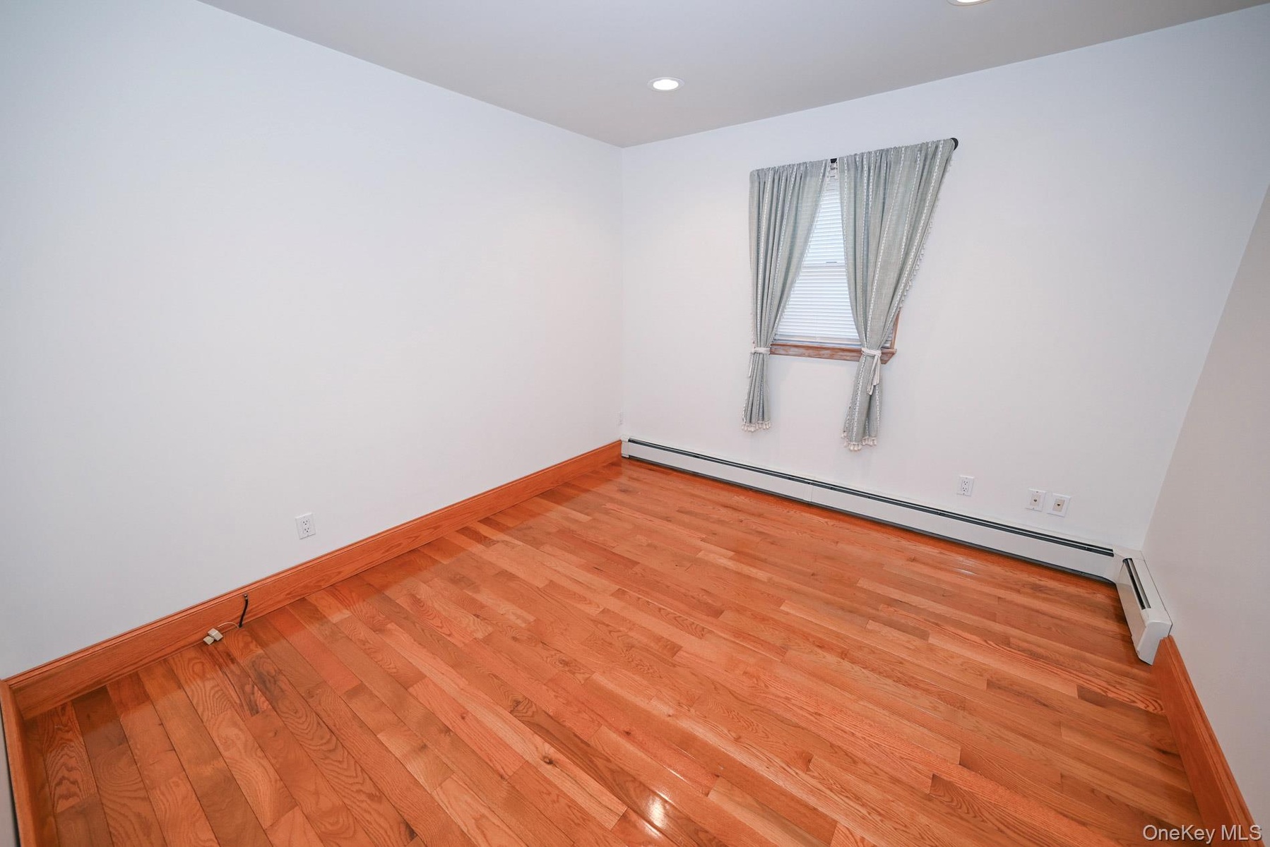 - Unfurnished room with light wood-style floors, a baseboard radiator, and recessed lighting