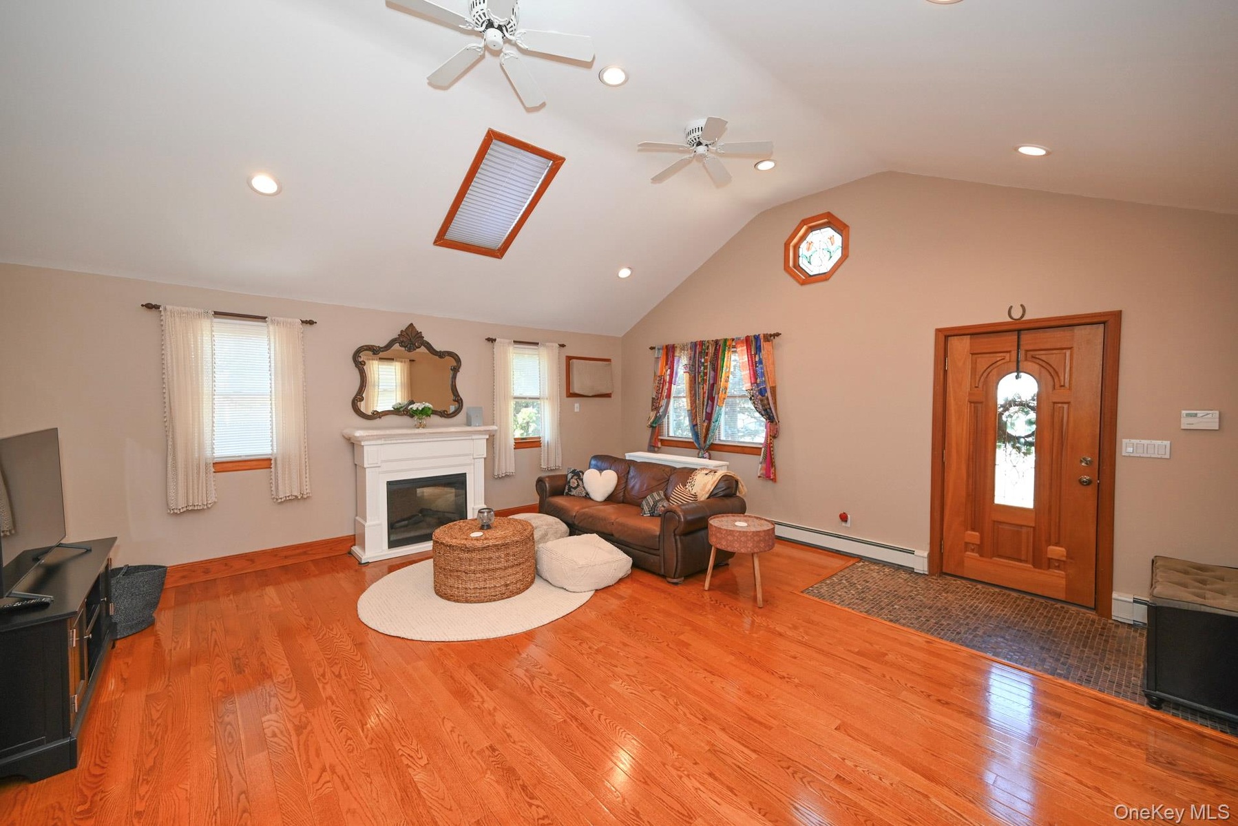 - Living area with vaulted ceiling, wood finished floors, a glass covered fireplace, recessed lighting, and a skylight