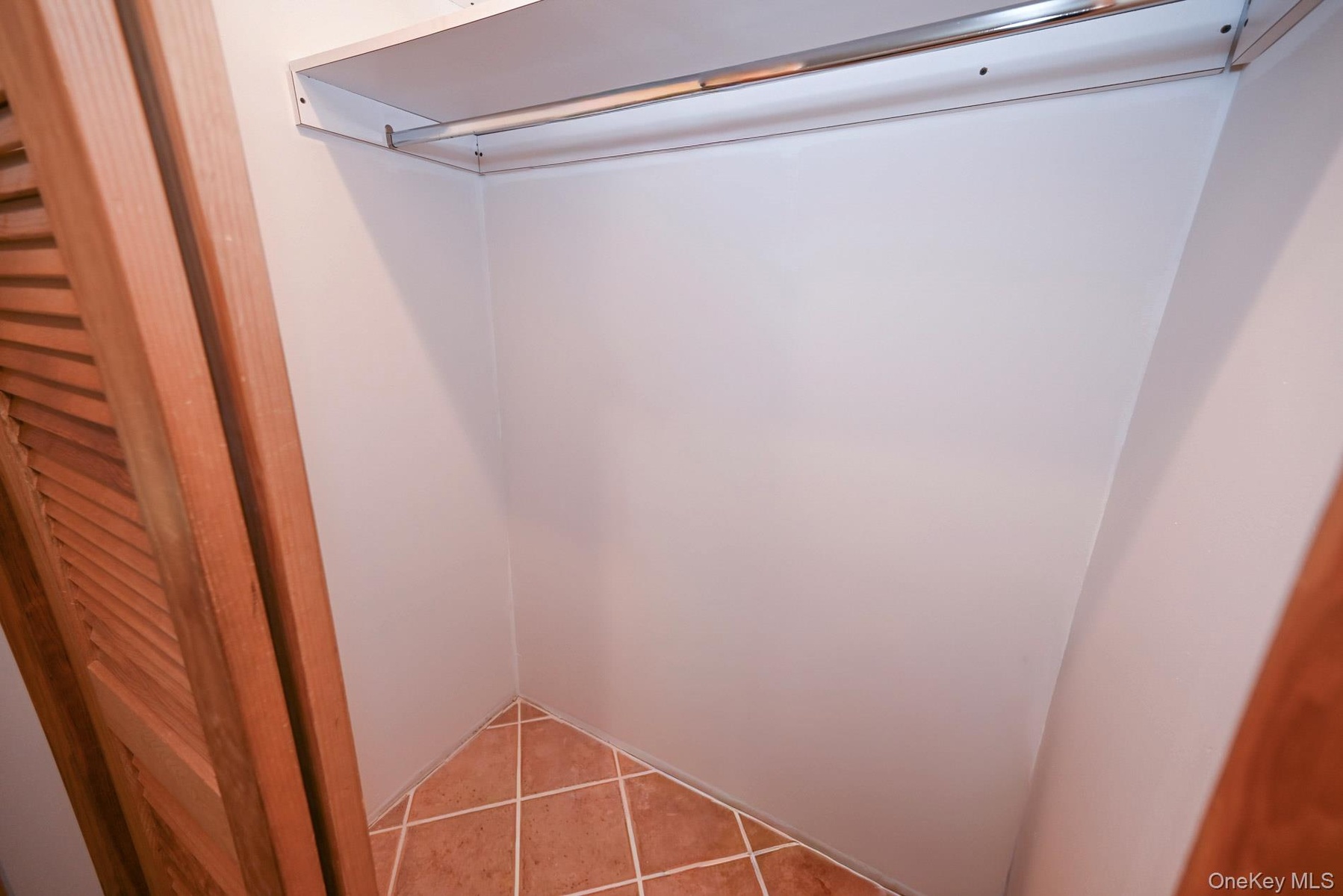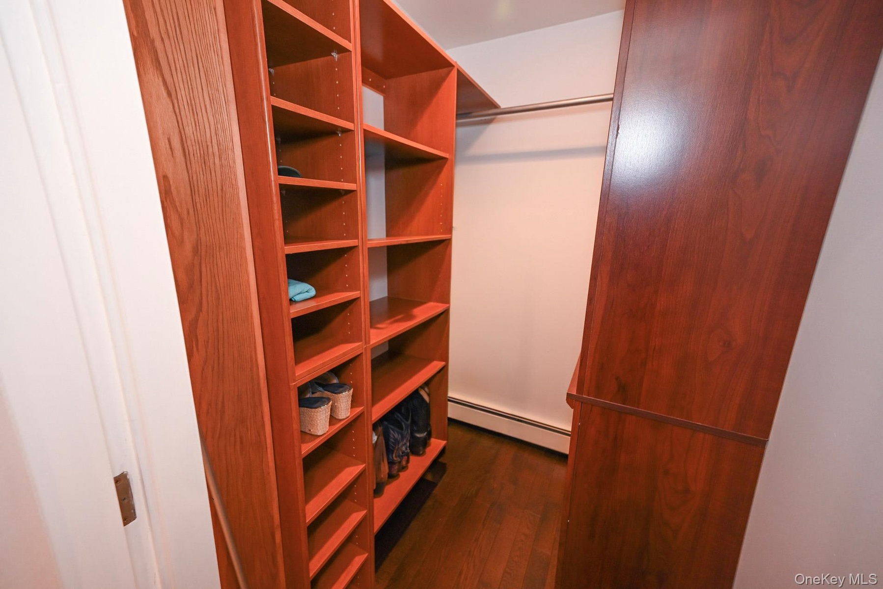 - Spacious closet featuring a baseboard radiator and dark wood finished floors