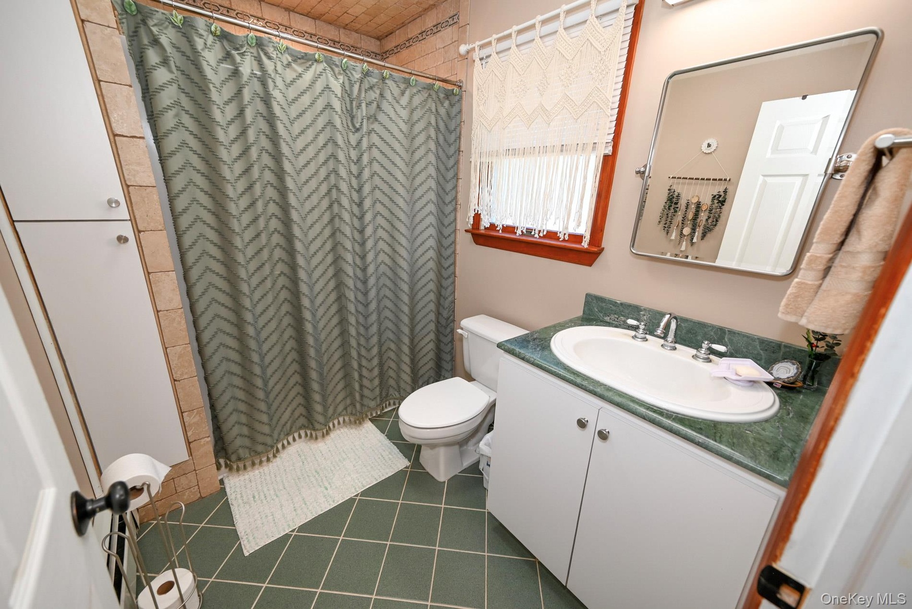 - Bathroom with dark tile patterned flooring, vanity, and a shower stall