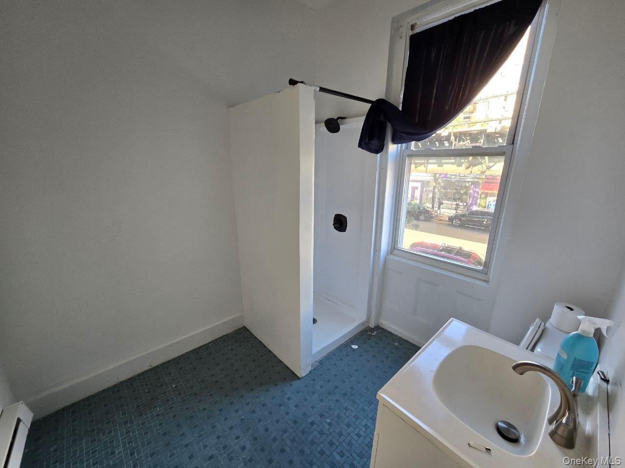 - Bathroom featuring a shower stall, vanity, and a baseboard heating unit