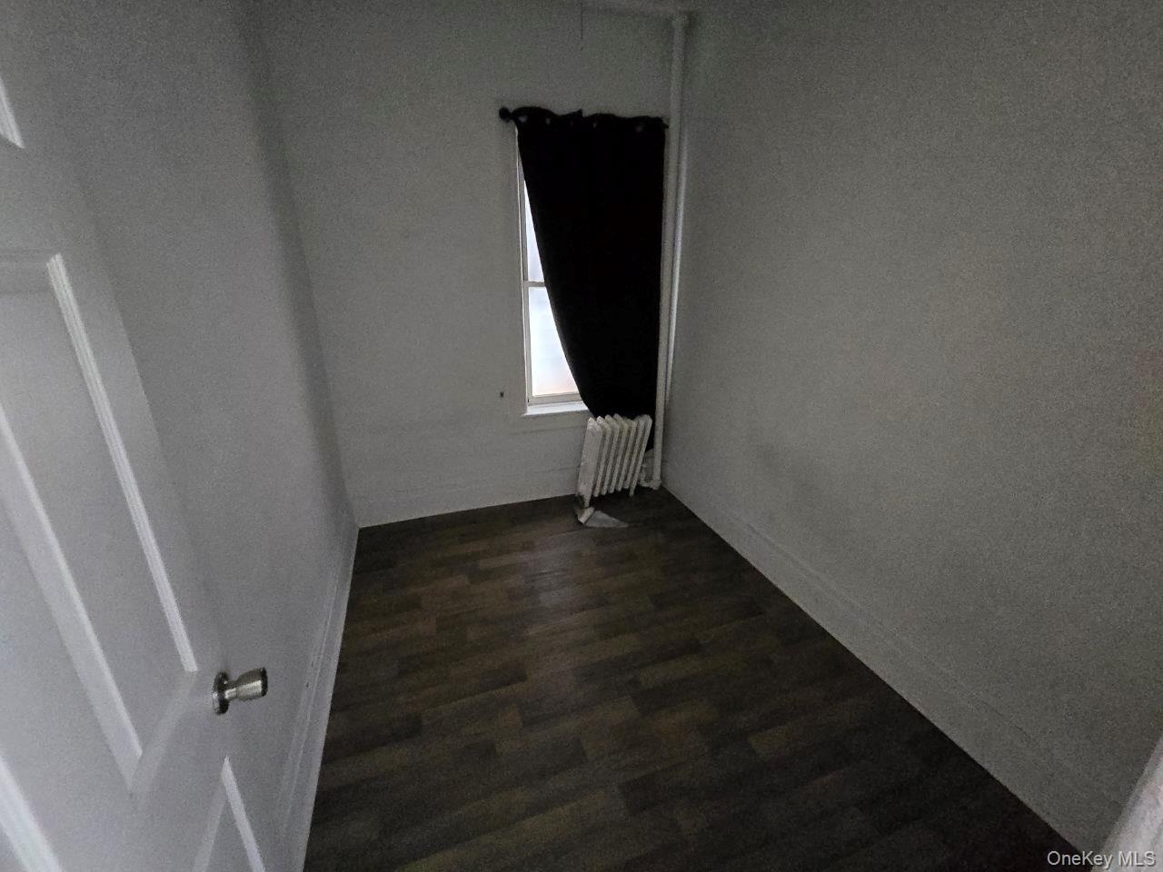 - Unfurnished bedroom featuring dark wood-type flooring, radiator heating unit, a ceiling fan, a baseboard radiator, and cooling unit