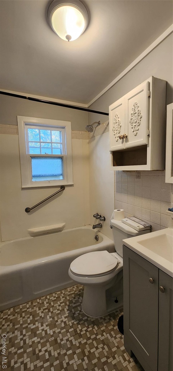- Full bathroom featuring backsplash, vanity, and tub / shower combination