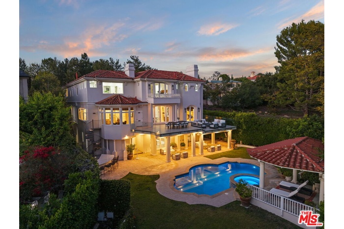 This Contemporary Mediterranean Estate is located in the highly sought after and exclusive 24-hour guard gated community of Bel Air Crest. Tucked away at the end of a quiet Cul-De-Sac with an additional gate shielding the driveway up to the home and adjacent to the greenbelt, this property is providing the utmost in privacy while still enjoying views of nearby MountainGate Country Club golf course and canyon. Stately impressions are made when entering into the foyer where you are met with soaring ceilings and a glass cupola dome, flagged by a double winged staircase exuding elegance. Seamlessly flowing into the formal dining room with French doors leading out to a 1,000 sq ft plus balcony overlooking the backyard and pool. The main level also boasts a gourmet kitchen, family room with fireplace, living room with fireplace, powder room and luxurious office space with built in bookshelves and a balcony. The upper level features an exquisite primary suite retreat with a private balcony, wet bar, double sided fireplace, steam and sauna in the renovated his and hers bathrooms and closets. There are 4 additional en suite bedrooms, one of which has its own private staircase entrance. The Garden level has 2 additional en suite bedrooms, a home theater, living/dining area with built in bar, wine cellar, gym, pool bathroom with shower, and laundry room with both indoor and outdoor access from the garden. The backyard is an entertainers dream with an additional 1,000 square feet covered patio complete with ceiling heat lamps, a built in BBQ and bar area, covered gazebo and beautifully redone pool and adjoining spa. Outdoor living in California at its best with these large entertaining areas surrounding the pool in addition to the outdoor deck added to the main floor. The community of Bel Air Crest offers 5 tennis courts, basketball courts, a dog park, playground and a newly remolded clubhouse with a well-equipped gym, meeting room, lounge space and kitchen. Live the perfect life in California.