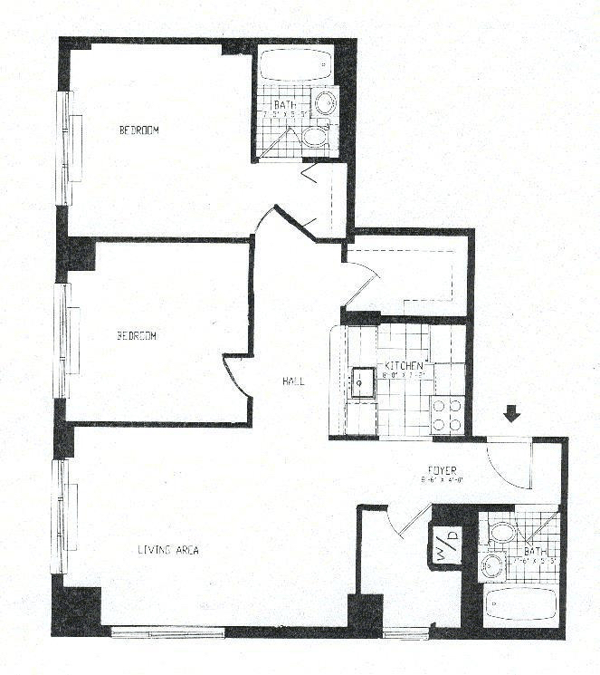 Designed with both elegance and functionality in mind, the residence features a thoughtful, spacious floor plan with rich hardwood flooring and soaring ceilings throughout. The chef’s kitchen is equipped with premium stainless steel appliances including a gas range, dishwasher, and mounted microwave. Marble bathrooms offer abundant storage and a refined aesthetic. Both bedrooms include generous closet space (not shown on the floor plan), and there is also a large walk-in closet located directly outside the bedrooms, providing exceptional storage options. A dedicated laundry and utility room with washer/dryer adds convenience rarely found in Manhattan living. Individually controlled PTAC heating and cooling units in every room ensure year-round comfort.