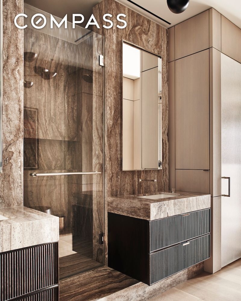 The private quarters are a masterclass in design. The primary suite is introduced by a mirrored door that cleverly disappears into the walls, creating a fluid boundary between public and private realms. Inside, upholstered suede walls imbue warmth, while a custom-outfitted dressing room in solid oak millwork accommodates the most extensive wardrobes and accessory collections. The spa-like bath is clad in floor-to-ceiling travertine and features dual vanities, a luxurious shower with dual shower heads, heated floors, and towel bars for a five-star experience.