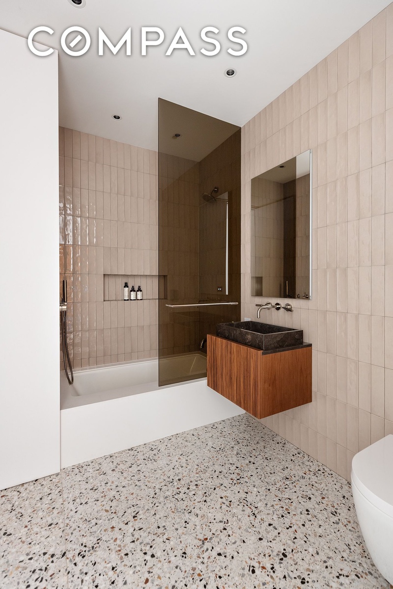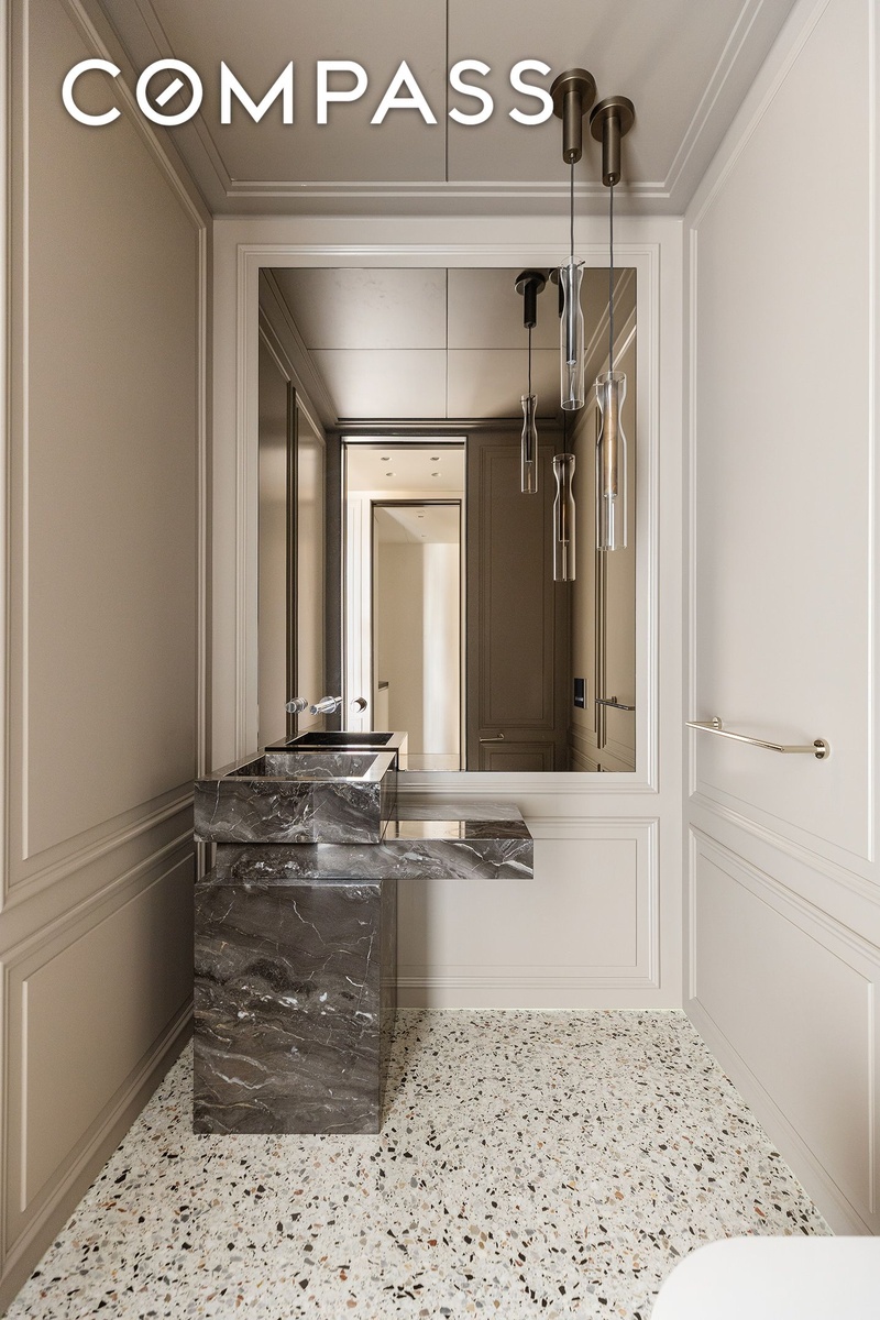 From the moment you enter, a sweeping floor-to-ceiling terrazzo expanse sets a glamorous tone, carrying seamlessly into the secondary bedroom, bath, powder room, and laundry. At the opposite end, an extraordinary 50-foot wall of double paned French doors outfitted with custom polished nickel cremone hardware opens onto a gracious terrace crowned with intricate wrought-iron detailing. The eastern views soar over SoHo’s rooftops, evoking a distinctly European sensibility in the midst of downtown Manhattan’s most vibrant neighborhood.