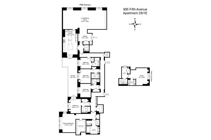 Apartment 2S/1E is a spacious and light-flooded 4,825 square foot, six bedroom residence located at 995 Fifth Avenue, a prewar cooperative with condominium by-laws, located within the boundaries of the Metropolitan Museum of Art Historic District at Fifth Avenue at East 81st Street.