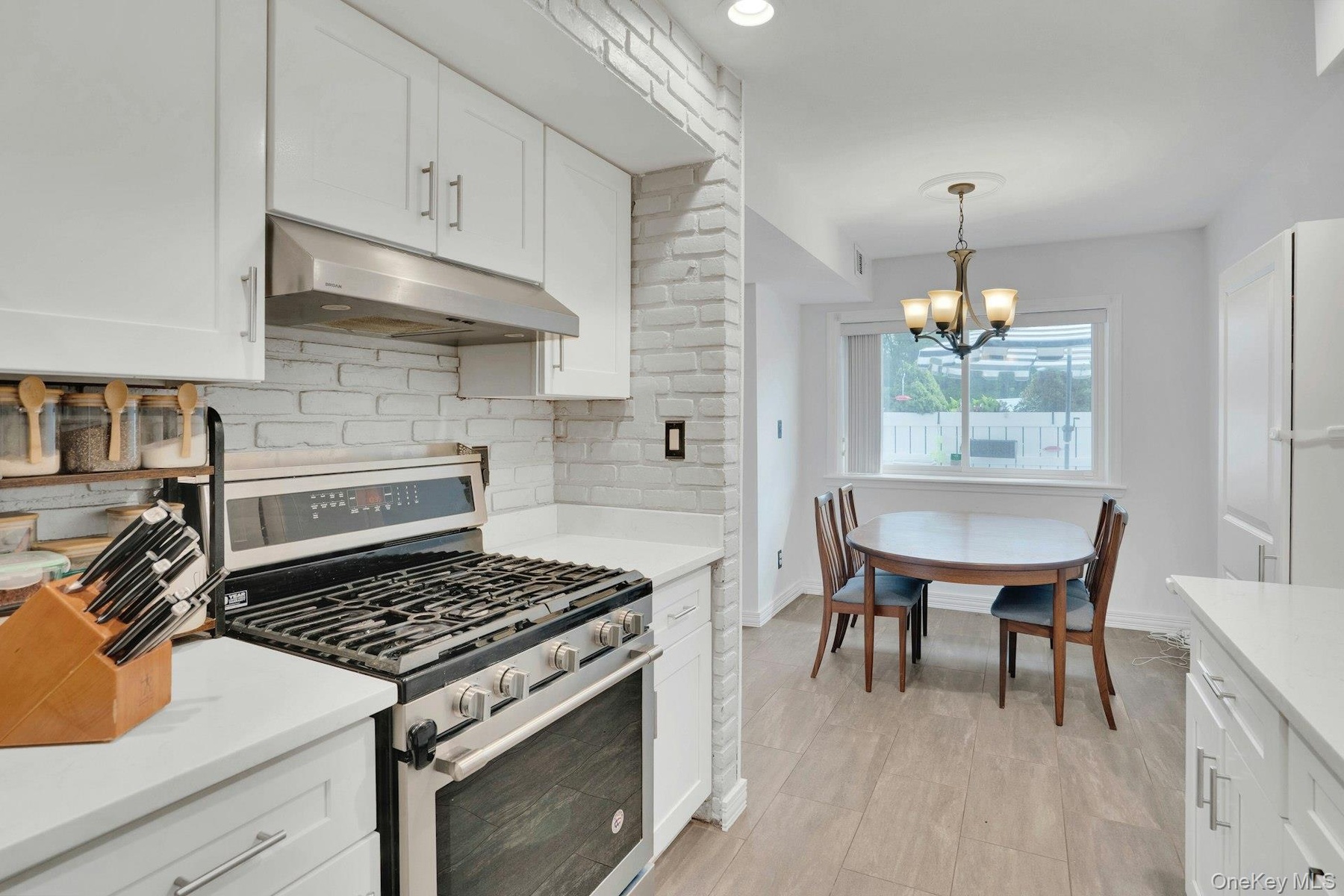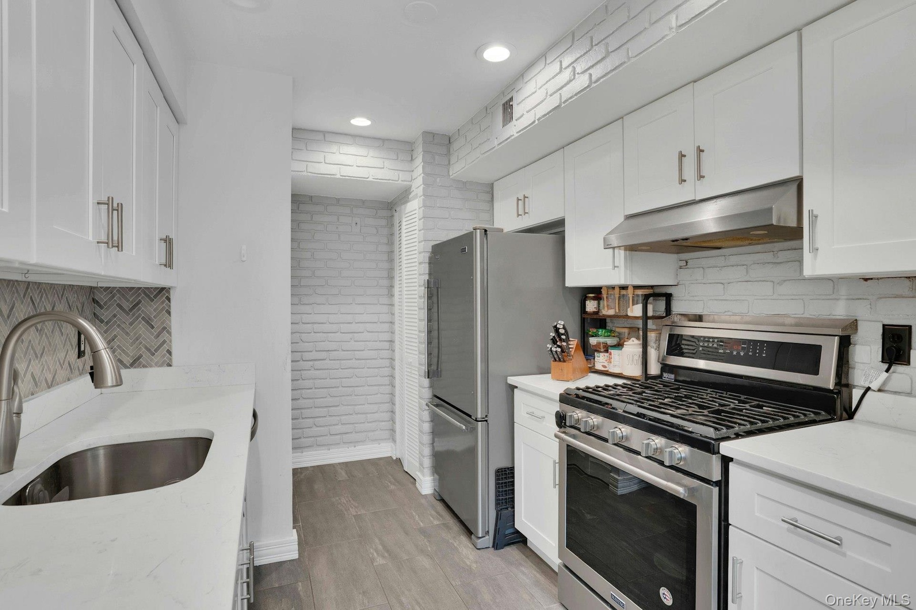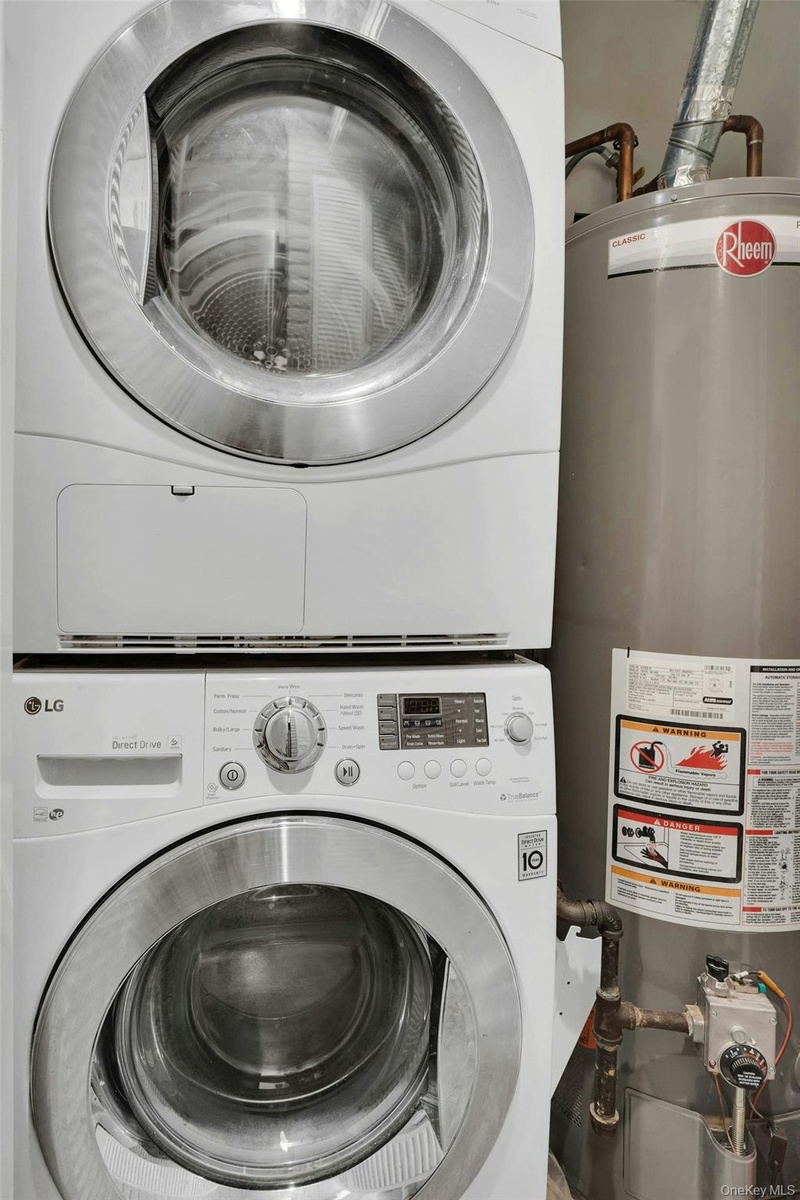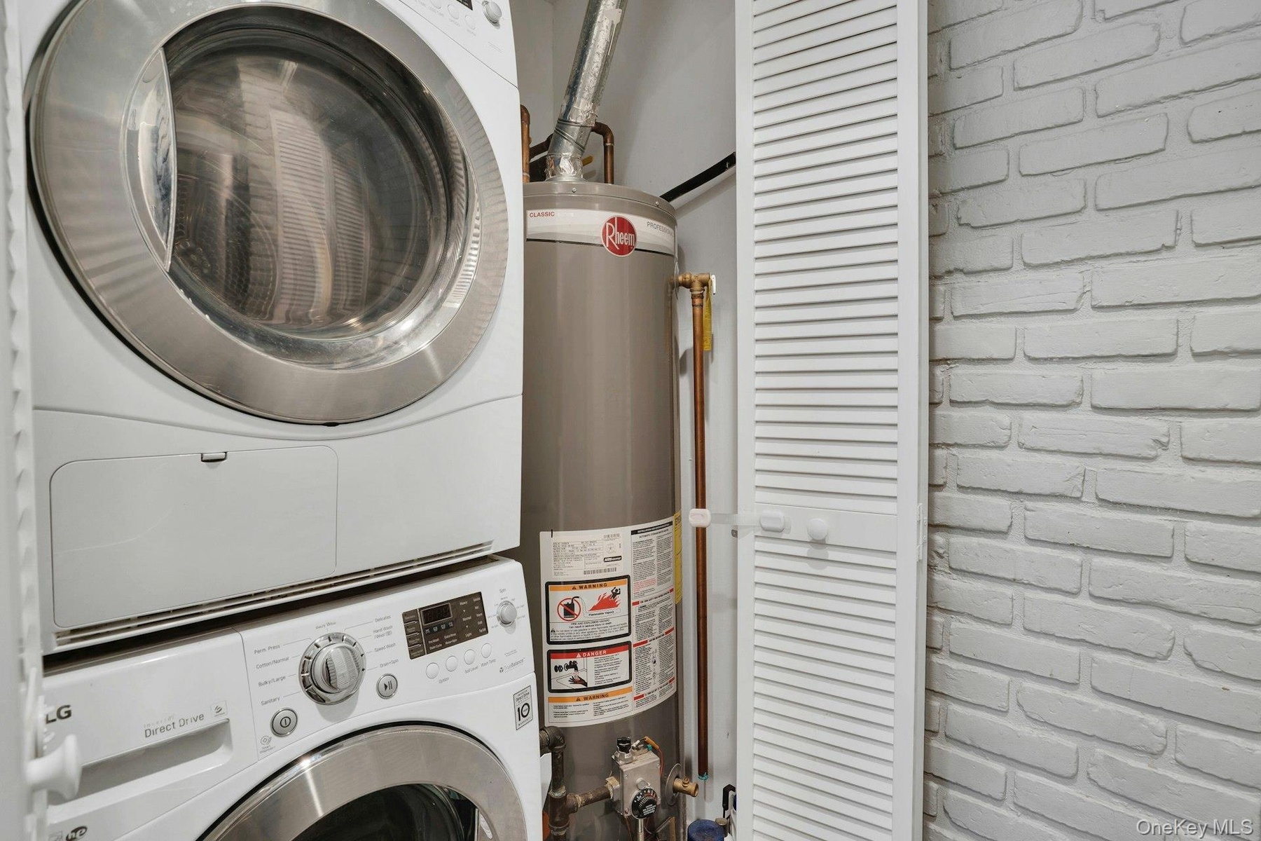 Step inside to find a bright and inviting layout with hardwood, tile, and wood-style vinyl flooring throughout. The galley kitchen features quartz countertops, white cabinetry, and stainless steel appliances, opening to a cozy dining area that’s perfect for everyday meals. A stackable washer and dryer are conveniently tucked beside the hot water heater and HVAC system for easy access.