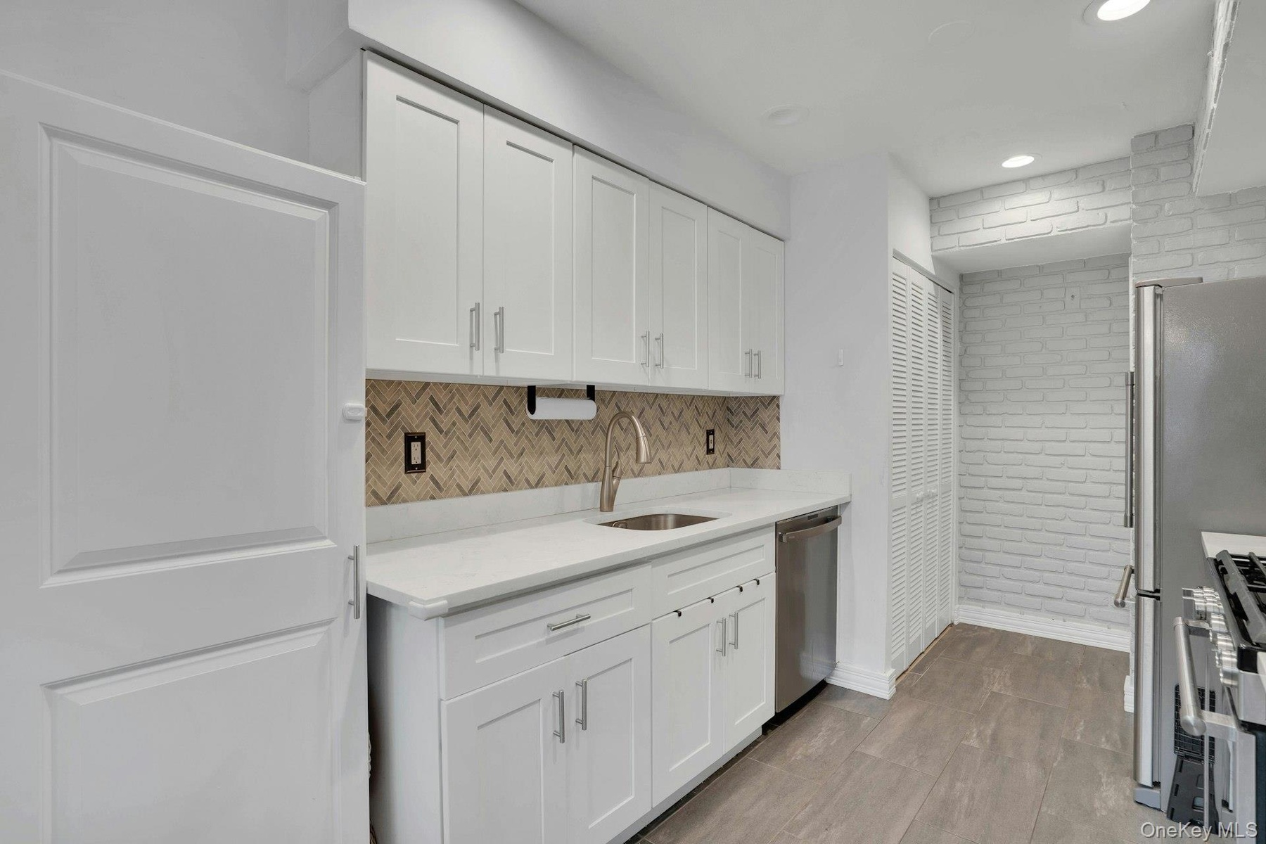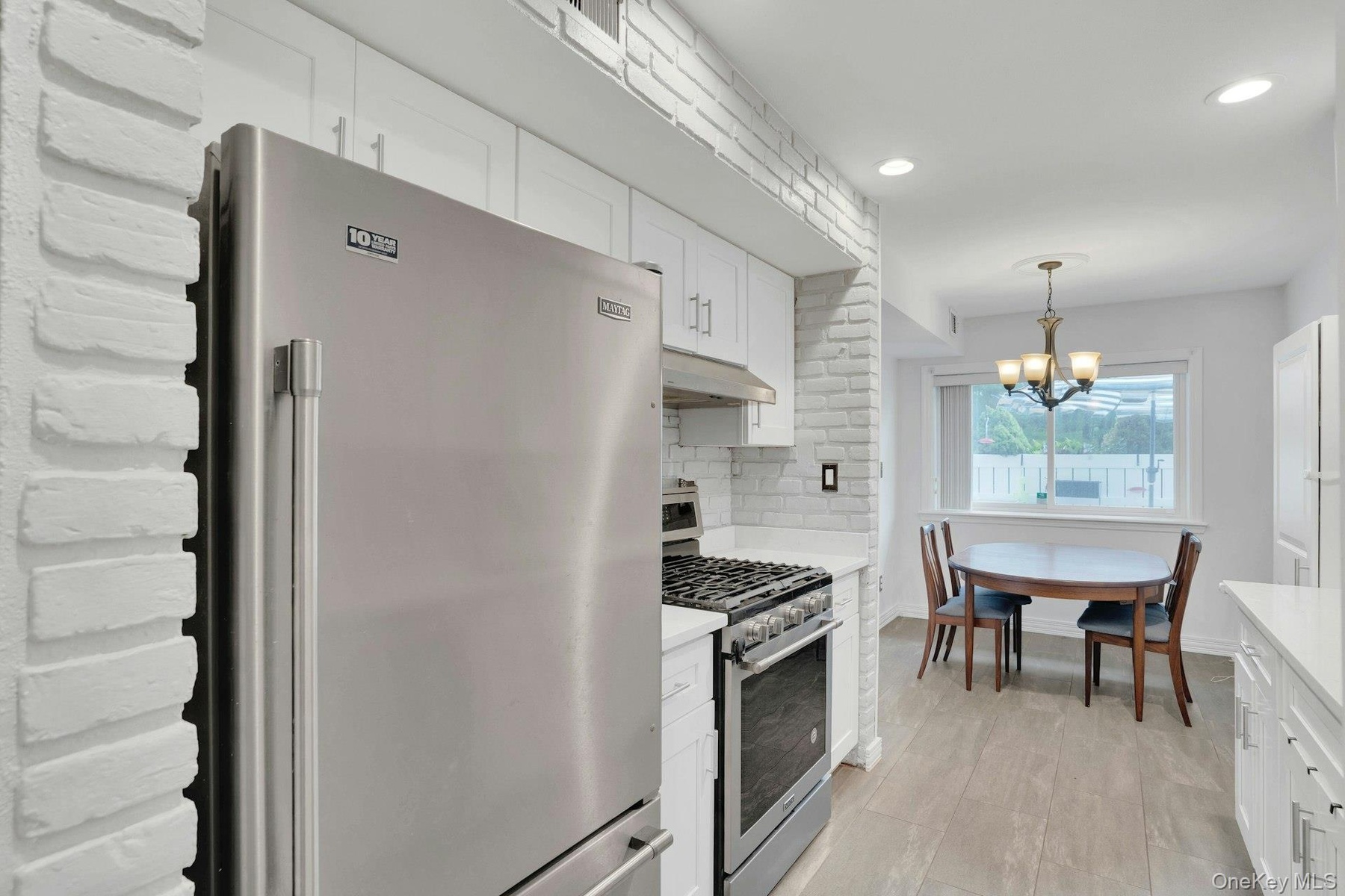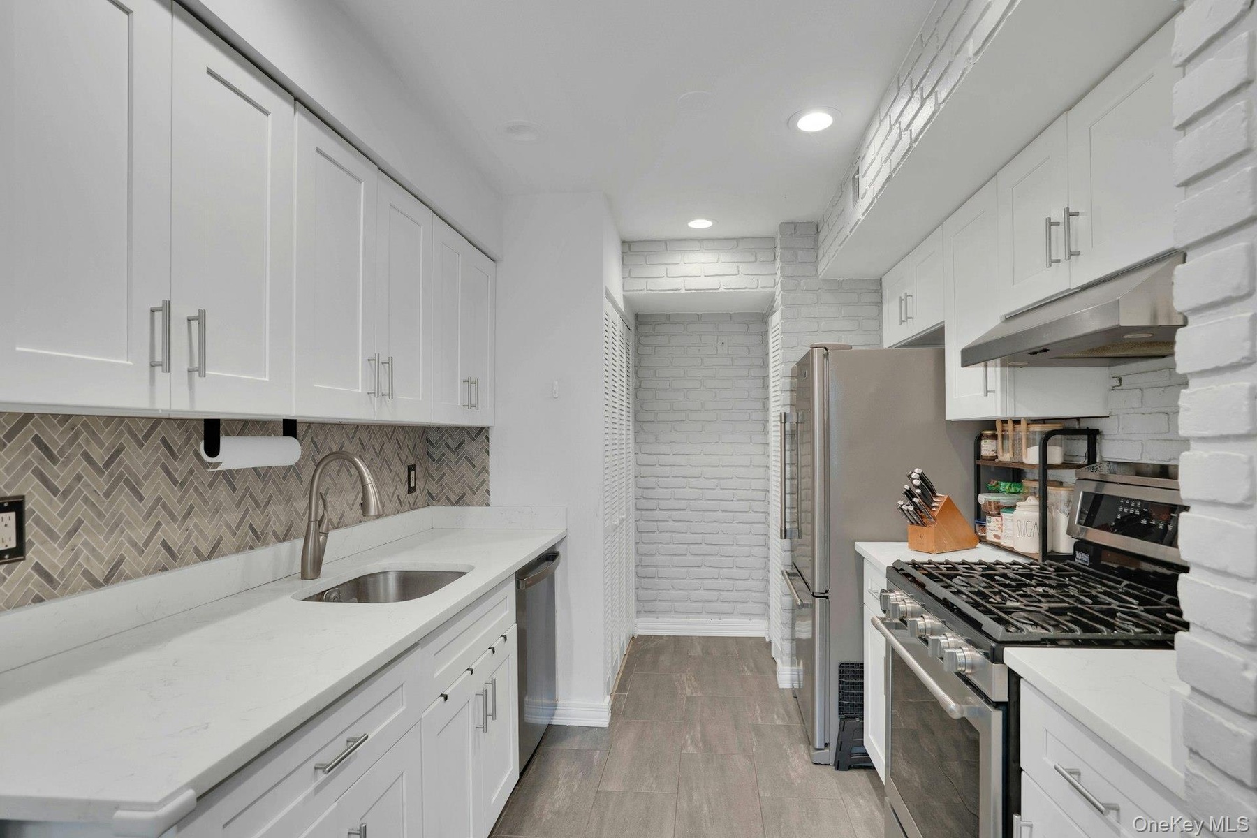 Step inside to find a bright and inviting layout with hardwood, tile, and wood-style vinyl flooring throughout. The galley kitchen features quartz countertops, white cabinetry, and stainless steel appliances, opening to a cozy dining area that’s perfect for everyday meals. A stackable washer and dryer are conveniently tucked beside the hot water heater and HVAC system for easy access.