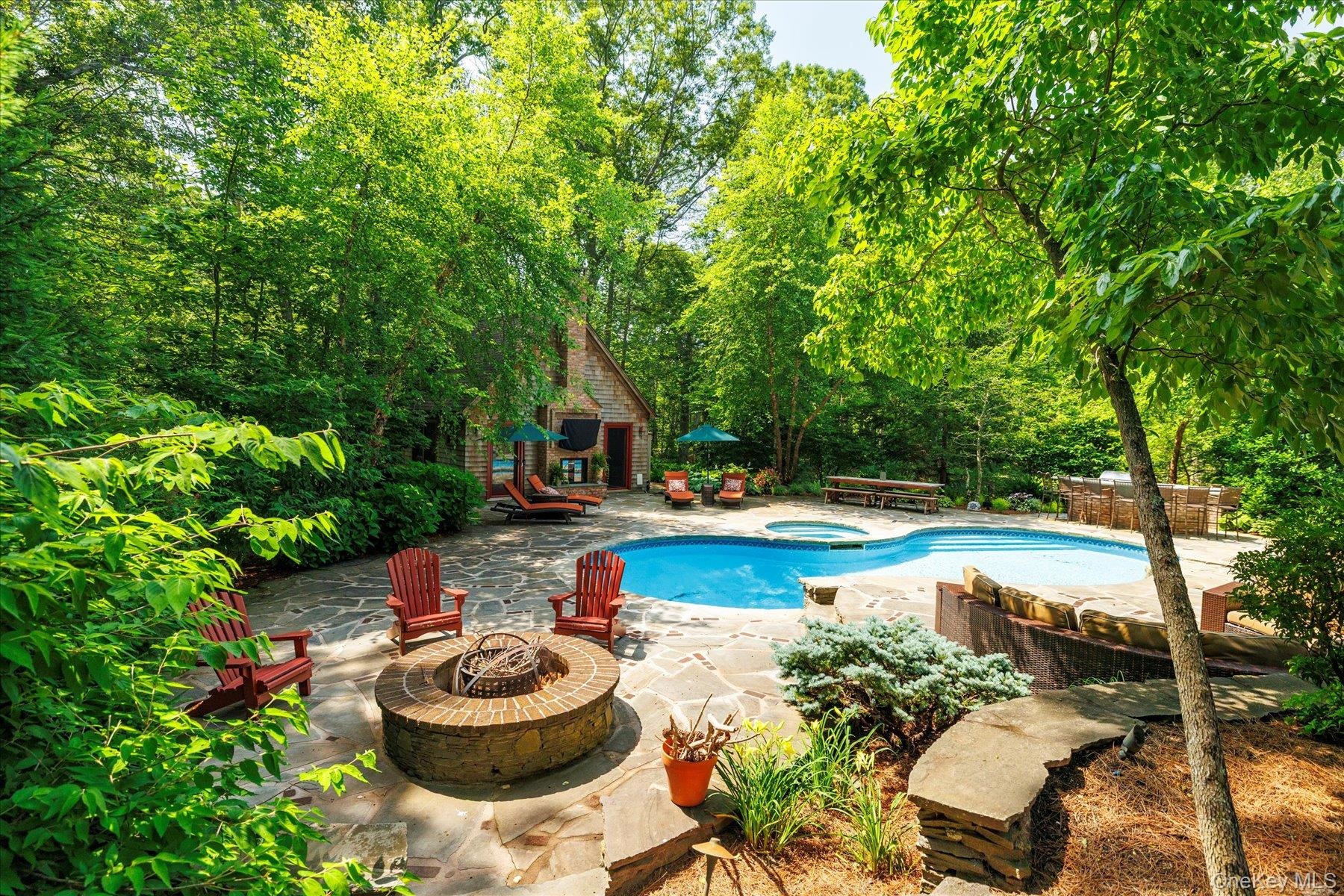 Outdoors, resort-style living continues around the heated saltwater pool and spa, complemented by a 400-square-foot pool house with outdoor shower, dual-sided fireplace, built-in TV, fire-pit area, and custom outdoor grill. The landscaped grounds include space for a tennis court, a pond, private parking area near the entrance, and a network of private trails within the property perimeter leading directly to Laurel Lake Preserve hiking paths.