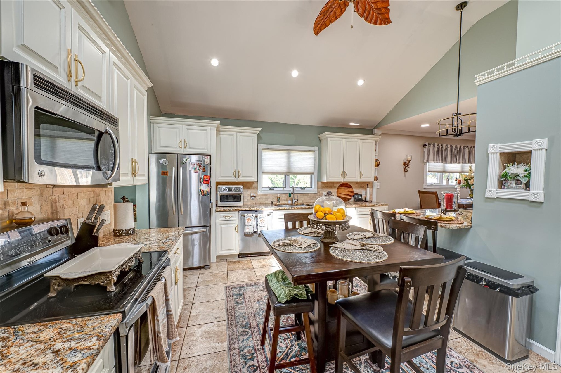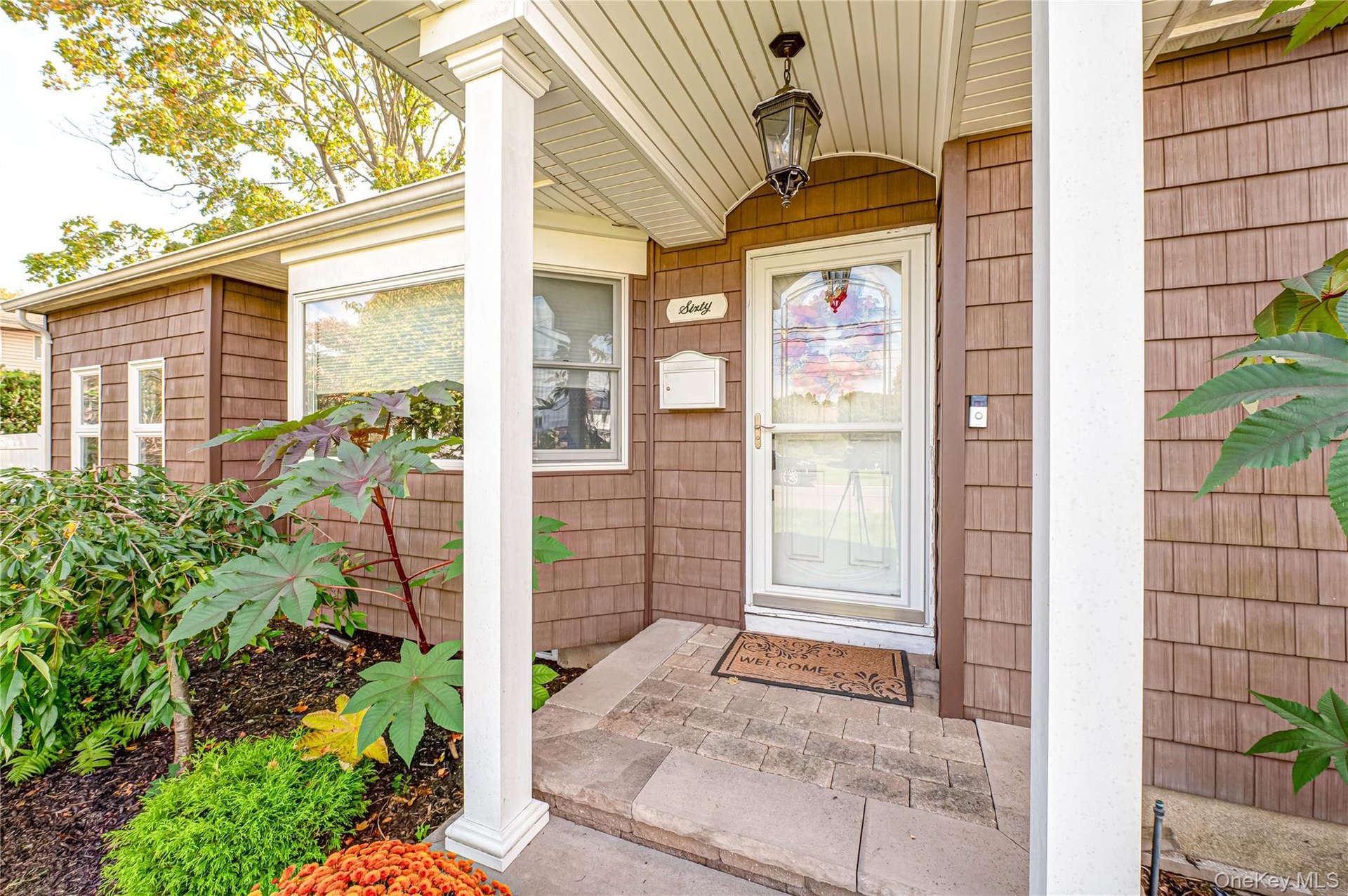 Welcome to this beautifully maintained single-family sprawling ranch nestled on a 107x100 lot in desirable North Babylon. This spacious home offers : 4 bedrooms, 3 full baths. 1,801 sq ft of living space, finished 782 sq ft basement with outside entrance which is perfect for entertaining or a home theater. Interior features: open floor plan with refinished hardwood floors, new carpeting in bedrooms and fresh paint throughout. Custom den with cathedral ceilings, whitewashed cedar planking, wood- burning fireplace, 8 ft sliding doors with remote custom blinds leading to a private brick-paved patio, oversized kitchen with cathedral ceilings, 2 skylights, newer cabinets, and granite countertops. Ductless heating and air conditioning throughout LR and DR. Primary suite with bath and skylights. Bedroom 2 converted to a walk-in closet, easily reversible. Bedroom 3 can serve as an office or guest room, Bedroom 4 is the original primary bedroom with closet. Basement: Finished with outside entrance, ideal for movies, entertainment or hobbies. Exterior features: Detached 1.5 car garage, 80 ft driveway, Backyard: custom brick pavers, fire pit, tiki bar, lighting and privacy hedges - a true oasis. Additional Highlights: Paid - off solar panels (7 years old) and 10-year-old roof, making electric costs nearly zero. Close to Belmont State Park, community pool, shopping, schools, Babylon Village and beaches.
