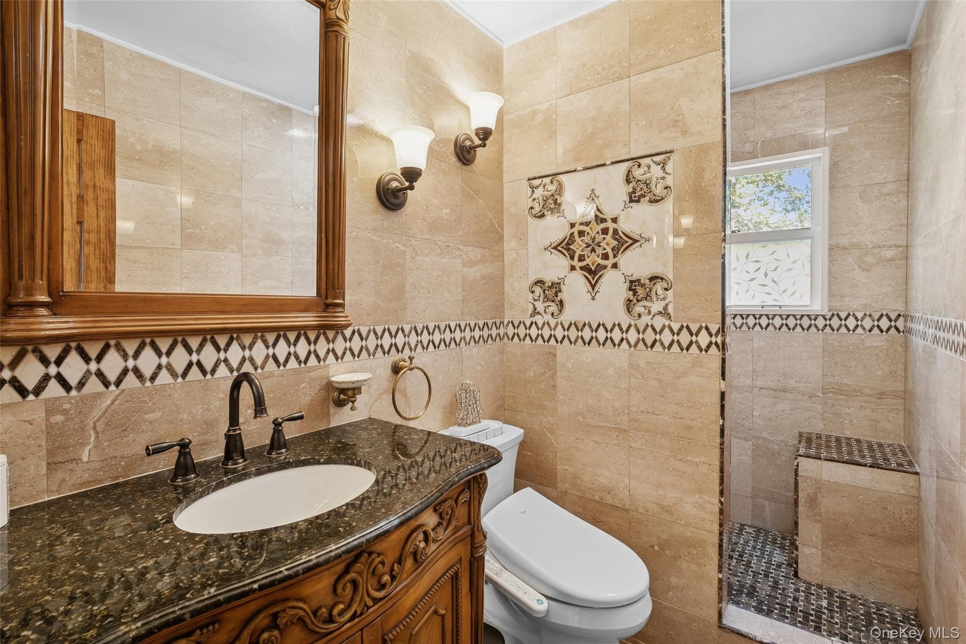 The grand entryway welcomes you with marble floors, a sweeping marble staircase, elegant mosaic tile, and crown moldings throughout the main level. The formal dining room features custom ceiling crown moldings, while the bright, open living room is ideal for entertaining. A warm and inviting family room boasts a wood-burning fireplace, flowing into a gourmet kitchen complete with granite countertops, matching backsplash, a double wall oven, and seating for ten. Also on the first floor is a maid's bedroom, a full marble bathroom with double vanity and