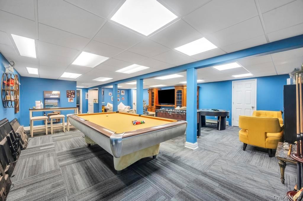 - Recreation room with pool table, carpet flooring, and a paneled ceiling