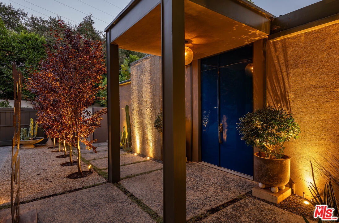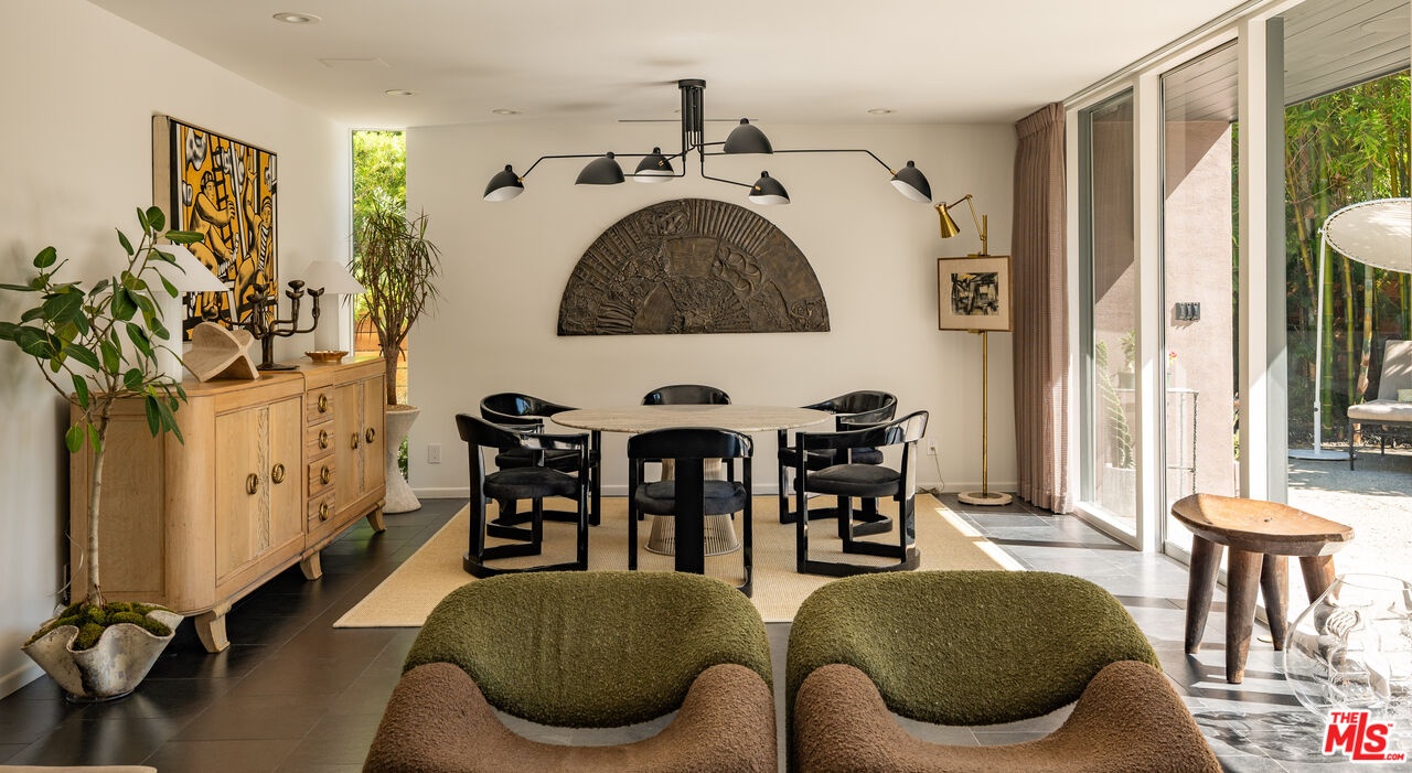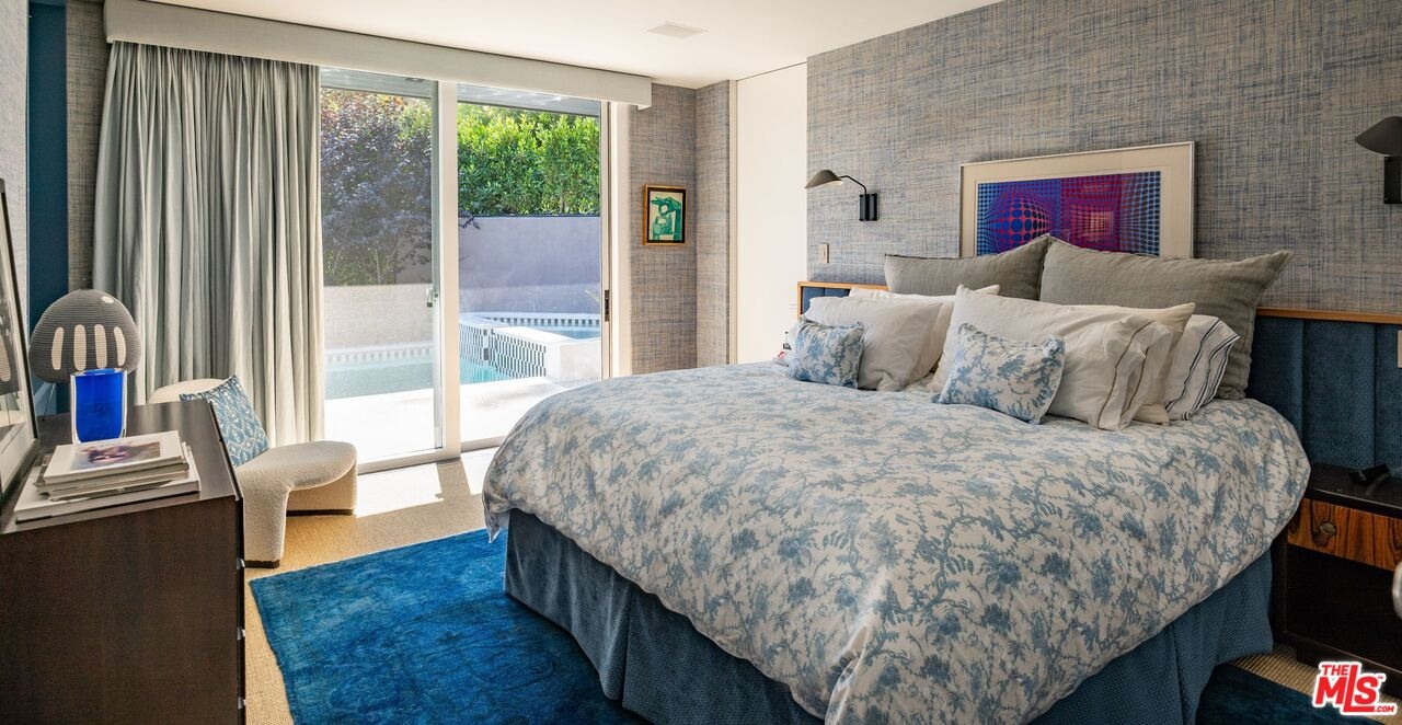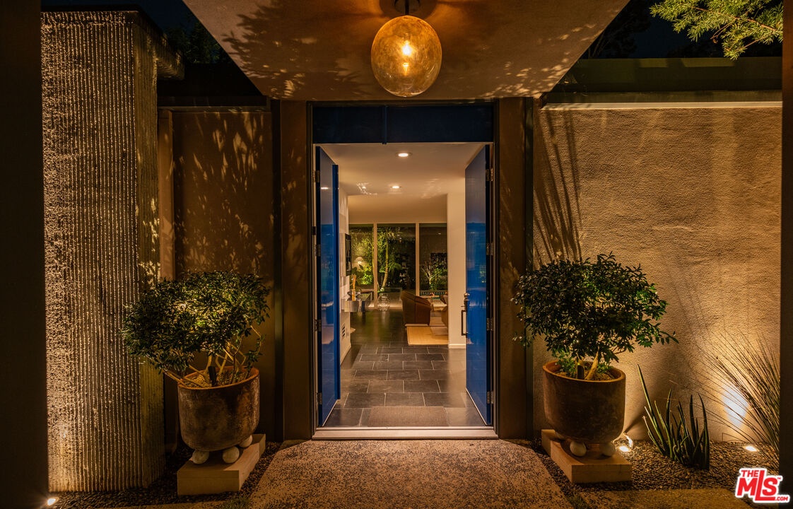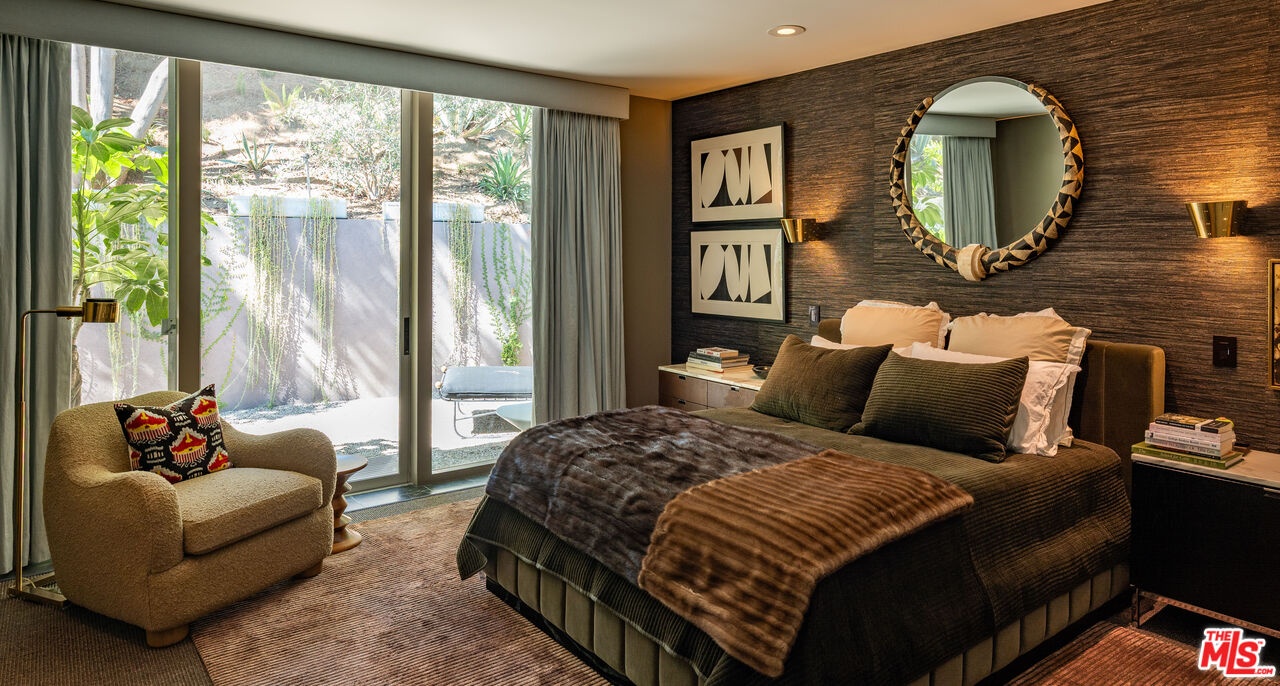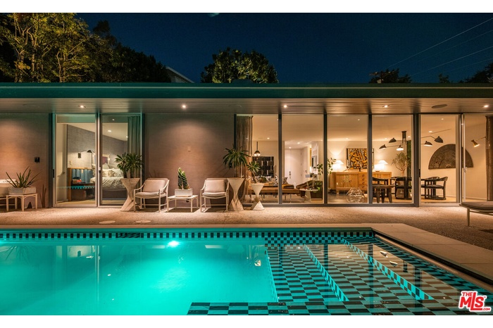 THE ULTIMATE BESPOKE BIRD STREETS JEWEL BOX. This sleek mid-century set behind gates and incredibly private, exudes elevated design at every turn. Inside, you'll find a superb floor plan separating the private quarters from principal spaces, creating ideal flow and functionality. The interiors are bathed in natural light, with floor-to-ceiling glass framing lush greenery outside while providing perfect walls for art inside. Black slate floors anchor the main living areas, while the living room features a striking stone clad fireplace. The gourmet galley kitchen features custom white oak cabinetry with brass mesh inserts, honed marble countertops, and exquisite detailing with top-line appliances and generous counter space. Every bathroom has been completely remodeled down to the studs with timeless materials and elegant finishes. The primary bath showcases travertine floors and walls, quartz countertops, and custom white oak wood paneling. The middle guest bath features a full travertine design with quartz counters and a tempered ribbed glass shower enclosure. A newly added guest powder room dazzles with black marble floors, Fornasetti designer wallpaper, and a one-piece Viola marble sink. The third bedroom features an ensuite bath adorned with oxblood and lavender marble finishes, burnished gold tile, and a relaxing sauna for the ultimate spa experience. Refined details abound throughout: most fixtures are unlacquered brass designed to develop natural patina over time, brass switch plates accent bathrooms and kitchen, and all lighting is dimmable. Quartz flooring adds durability to bathrooms and the newly added section. Outdoors, the home's mid-century architecture continues to shine. The completely redone pool features a new jacuzzi, waterfall feature, and automatic cover serving as the centerpiece of this tranquil retreat. Professionally designed landscaping and mature plantings create a seamless indoor-outdoor connection. Multiple sitting areas invite both quiet reflection and stylish entertainment, while a secluded outdoor shower adds resort luxury. Perimeter walls surround the driveway, with a security gate and LED strip lighting. The home can also be purchased fully furnished for an additional $200,000. By appointment only.