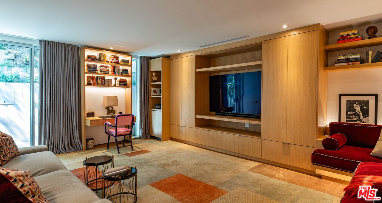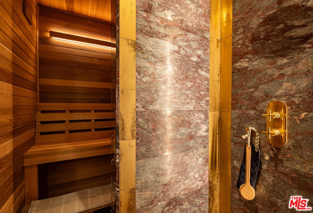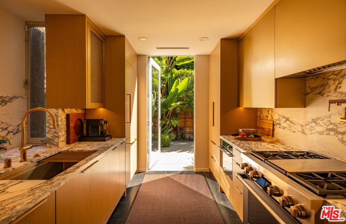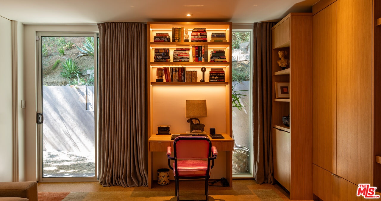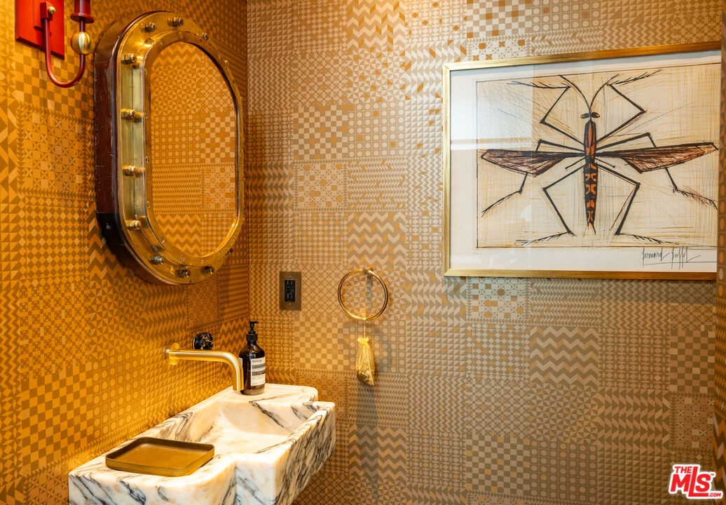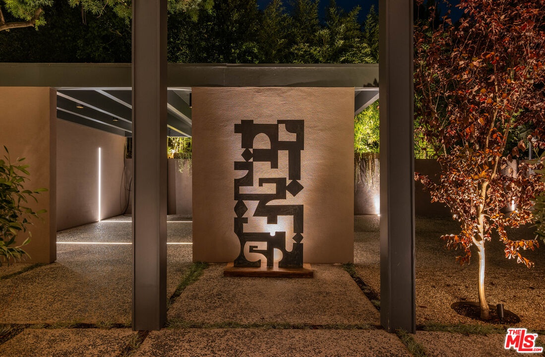 THE ULTIMATE BESPOKE BIRD STREETS JEWEL BOX. This sleek mid-century set behind gates and incredibly private, exudes elevated design at every turn. Inside, you'll find a superb floor plan separating the private quarters from principal spaces, creating ideal flow and functionality. The interiors are bathed in natural light, with floor-to-ceiling glass framing lush greenery outside while providing perfect walls for art inside. Black slate floors anchor the main living areas, while the living room features a striking stone clad fireplace. The gourmet galley kitchen features custom white oak cabinetry with brass mesh inserts, honed marble countertops, and exquisite detailing with top-line appliances and generous counter space. Every bathroom has been completely remodeled down to the studs with timeless materials and elegant finishes. The primary bath showcases travertine floors and walls, quartz countertops, and custom white oak wood paneling. The middle guest bath features a full travertine design with quartz counters and a tempered ribbed glass shower enclosure. A newly added guest powder room dazzles with black marble floors, Fornasetti designer wallpaper, and a one-piece Viola marble sink. The third bedroom features an ensuite bath adorned with oxblood and lavender marble finishes, burnished gold tile, and a relaxing sauna for the ultimate spa experience. Refined details abound throughout: most fixtures are unlacquered brass designed to develop natural patina over time, brass switch plates accent bathrooms and kitchen, and all lighting is dimmable. Quartz flooring adds durability to bathrooms and the newly added section. Outdoors, the home's mid-century architecture continues to shine. The completely redone pool features a new jacuzzi, waterfall feature, and automatic cover serving as the centerpiece of this tranquil retreat. Professionally designed landscaping and mature plantings create a seamless indoor-outdoor connection. Multiple sitting areas invite both quiet reflection and stylish entertainment, while a secluded outdoor shower adds resort luxury. Perimeter walls surround the driveway, with a security gate and LED strip lighting. The home can also be purchased fully furnished for an additional $200,000. By appointment only.