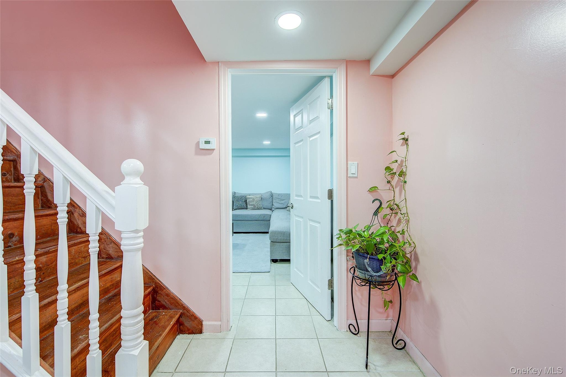 - Corridor featuring stairway, light tile patterned flooring, and recessed lighting